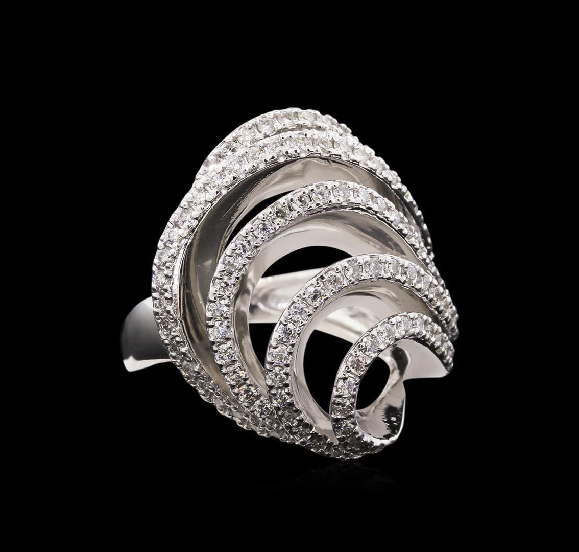 One electronically tested 14KT white gold lady's cast fashion ring with a bright polish finish. The featured ring has wave motif and a shank measuring 2.80 millimeters in width. Identified with markings of "K14". Condition is new, good workmanship. Containing: One Hundred Twenty prong set round brilliant cut diamonds, measuring 1.40 - 1.30 x 0.84mm (depth est.) approximate total weight of 120 Stones = 1.11ct. Graded in the setting. Clarity: VS-2 to SI-2. Color: H - I. Cut Good. Total Weight of Diamonds 1.11ct. Total Weight of Ring 13.10gm. GAS Appraised.