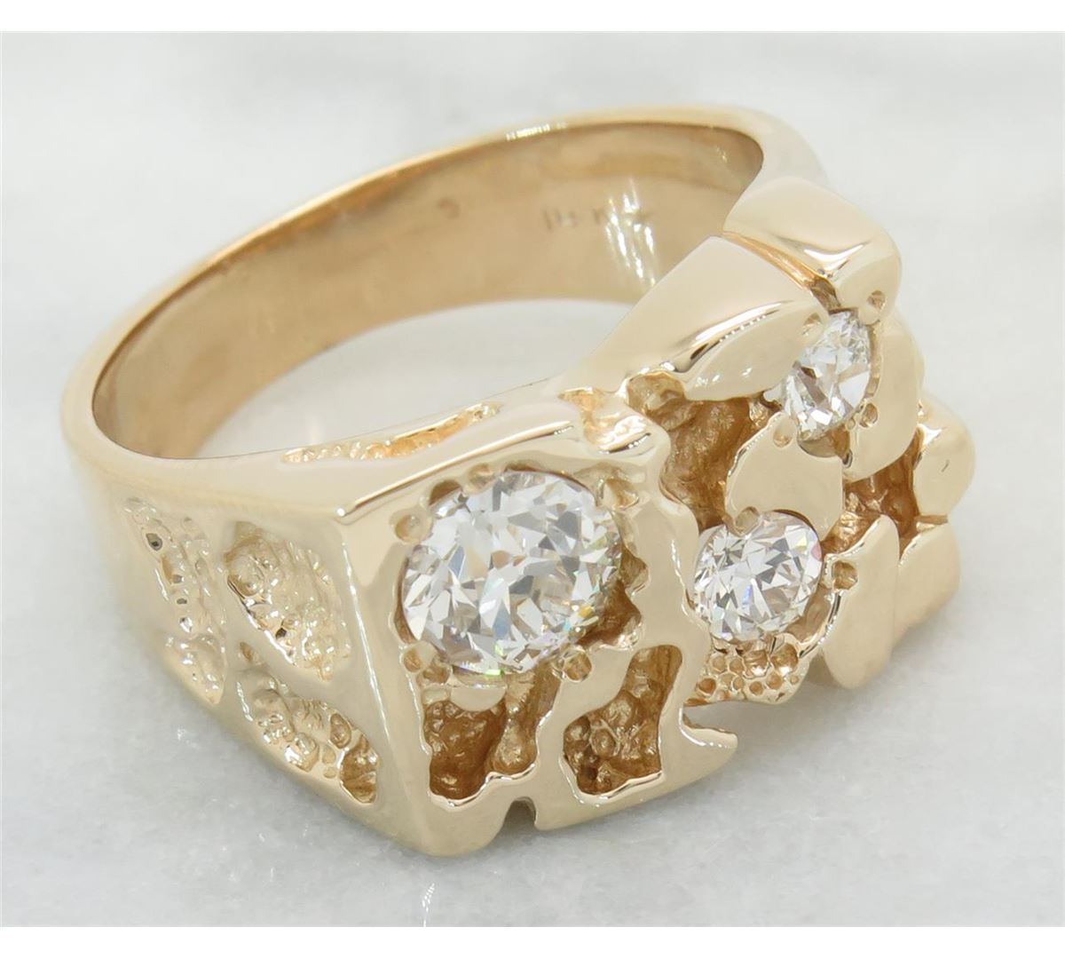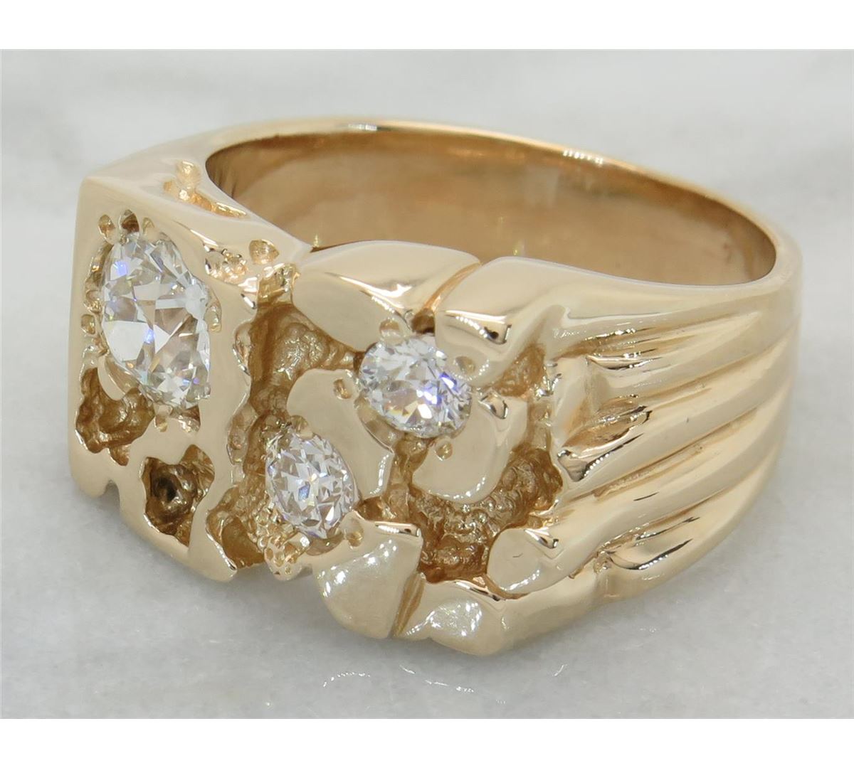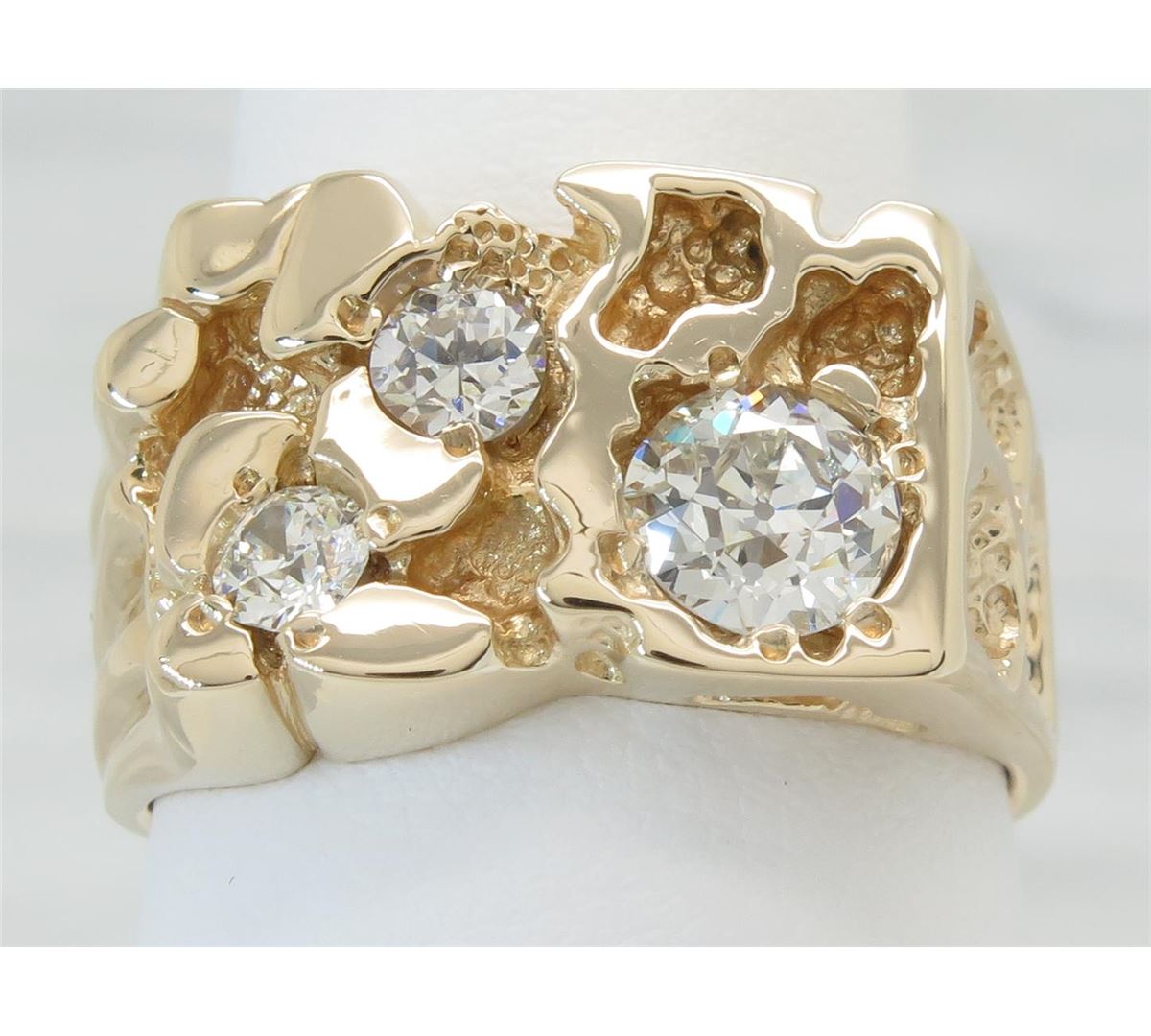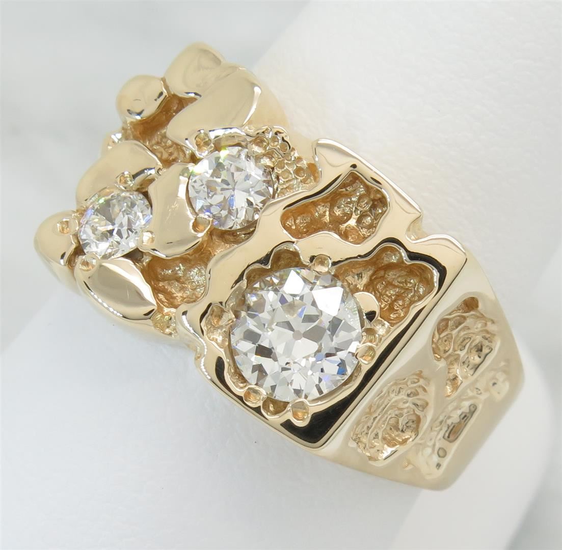 One tested 14K yellow gold mens diamond nugget ring. Containing: One .73CT Old European Cut Diamond. Clarity: SI1, Color: G-H. Two Transitional Cut Diamonds. Approximate total diamond weight: 1.11CTW. All diamonds are graded in the mounting unless otherwise stated. Weight of ring: 11.5 grams, Size: 8.25.