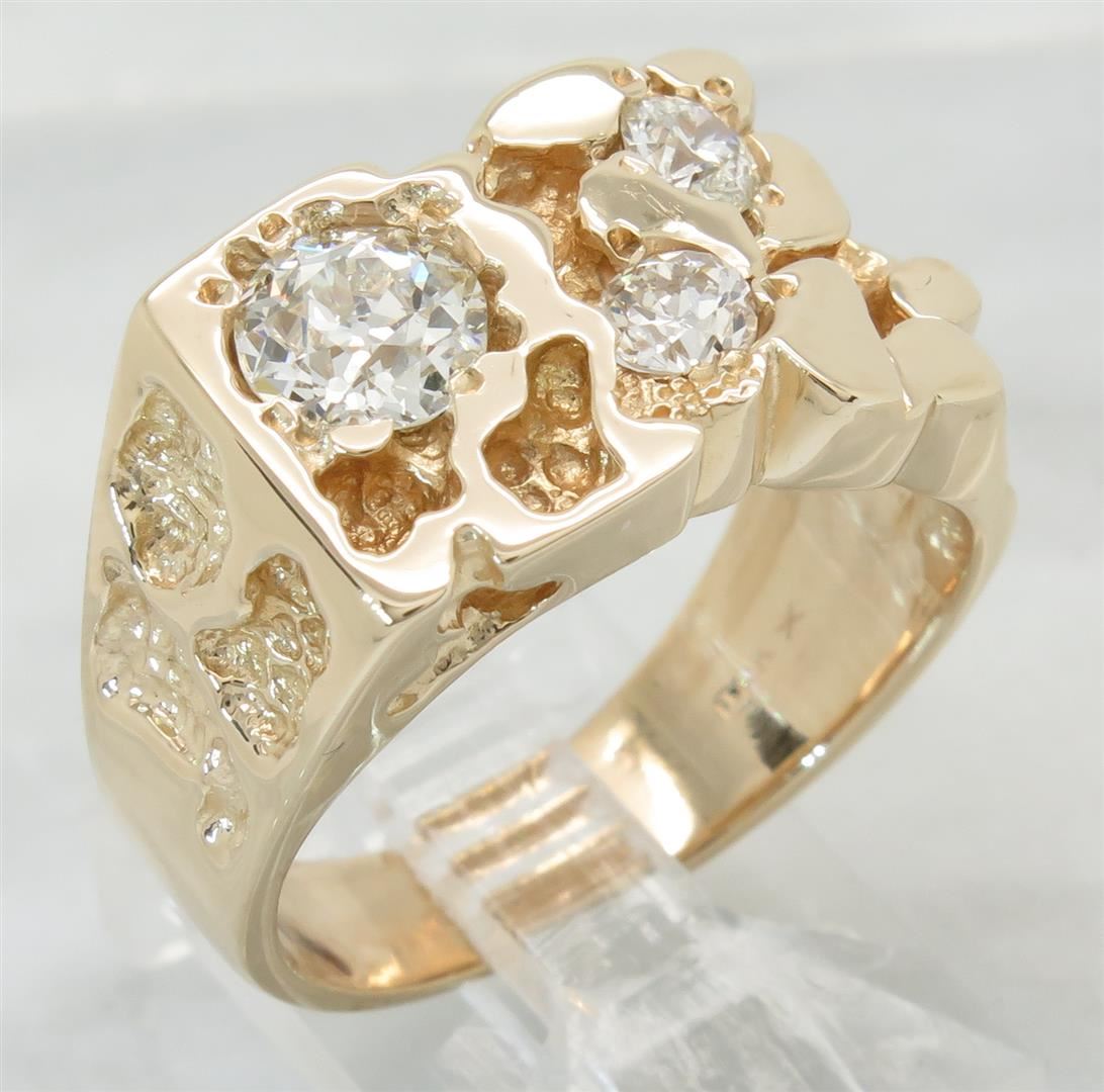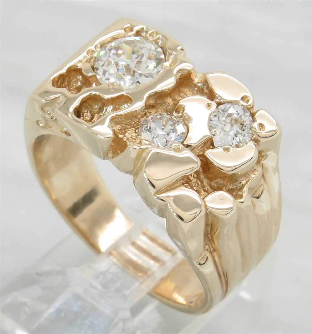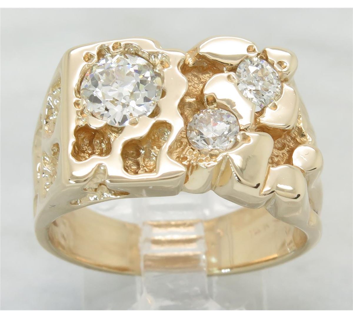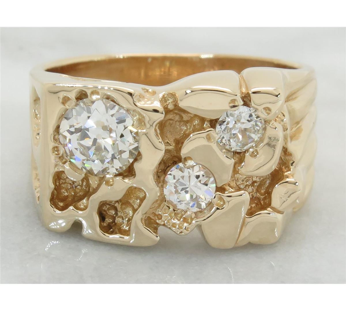One tested 14K yellow gold mens diamond nugget ring. Containing: One .73CT Old European Cut Diamond. Clarity: SI1, Color: G-H. Two Transitional Cut Diamonds. Approximate total diamond weight: 1.11CTW. All diamonds are graded in the mounting unless otherwise stated. Weight of ring: 11.5 grams, Size: 8.25.