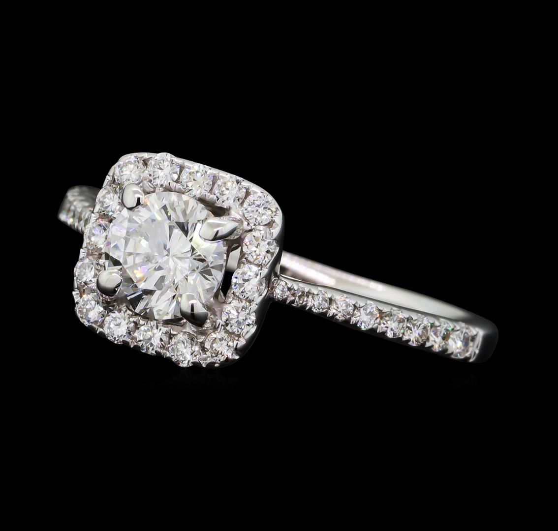 One electronically tested 18KT white gold lady's cast wedding ring with a cathedral shank with a basket halo with a bright polish finish. The featured lady's ring has a shank measuring 1.65 millimeters wide. Identified with markings of '750'. Condition is new, good workmanship. Containing: One prong set round brilliant cut diamond, measuring 5.63 - 5.61 x 3.37mm (depth est.) , 5.00.%. GTCF approximate weight of 0.70ct. Graded in the setting. Clarity I-1. Color: H Cut Good Eighteen prong set round brilliant cut diamonds, measuring 1.70 - 1.60 x 1.02mm (depth est.) approximate total weight of 18 Stones = 0.31ct. Graded in the setting. Clarity VS-1 to VS-2. Color: G - H Cut Very Good Sixteen prong set round brilliant cut diamonds, measuring 1.30 - 1.05 x 0.73mm (depth est.) approximate total weight of 16 Stones = 0.10ct. Graded in the setting. Clarity VS-1 to VS-2. Color: G - H Cut Very Good. Total Weight of Diamonds 1.11ct.. Total Weight of Ring 2.80gm GAS Appraised at $5,995.00.