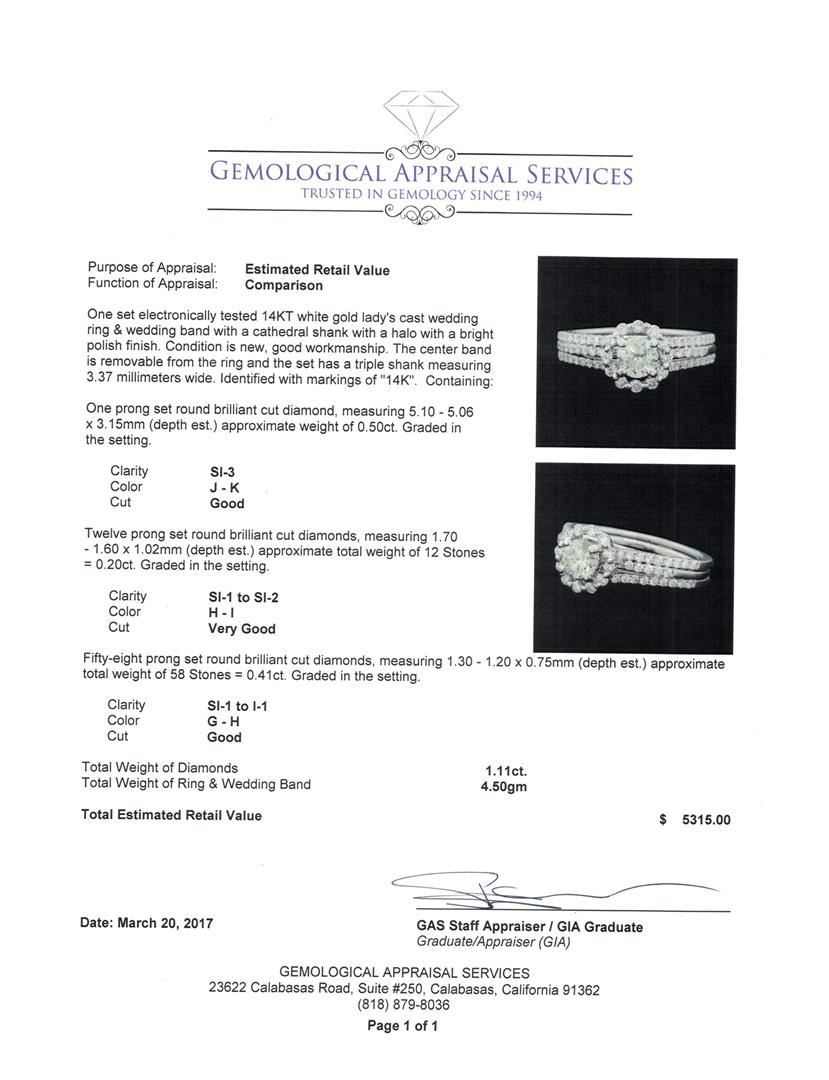 One set electronically tested 14KT white gold lady's cast wedding ring & wedding band with a cathedral shank with a halo with a bright polish finish. The center band is removable from the ring and the set has a triple shank measuring 3.37 millimeters wide. Identified with markings of '14K'. Condition is new, good workmanship. Containing: One prong set round brilliant cut diamond, measuring 5.10 - 5.06 x 3.15mm (depth est.) approximate weight of 0.50ct. Graded in the setting. Color J - K Clarity SI-3 Cut Good Twelve prong set round brilliant cut diamonds, measuring 1.70 - 1.60 x 1.02mm (depth est.) approximate total weight of 12 Stones = 0.20ct. Graded in the setting. Color H - I Clarity SI-1 to SI-2 Cut Very Good Fifty-Eight prong set round brilliant cut diamonds, measuring 1.30 - 1.20 x 0.75mm (depth est.) approximate total weight of 58 Stones = 0.41ct. Graded in the setting. Color G - H Clarity SI-1 to I-1 Cut Good. Total Weight of Diamonds 1.11ct.. Total Weight of Ring & Wedding Band 4.50gm GAS Appraised at $5,315.00.
