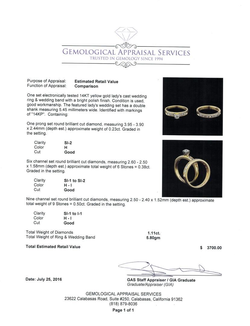 One set electronically tested 14KT yellow gold lady's cast wedding ring & wedding band with a bright polish finish. The featured lady's wedding set has a double shank measuring 5.45 millimeters wide. Identified with markings of '14KP'. Condition is used, good workmanship. Containing: One prong set round brilliant cut diamond, measuring 3.95 - 3.90 x 2.44mm (depth est.) approximate weight of 0.23ct. Graded in the setting. Clarity SI-2. Color: H Cut Good Six channel set round brilliant cut diamonds, measuring 2.60 - 2.50 x 1.58mm (depth est.) approximate total weight of 6 Stones = 0.38ct. Graded in the setting. Clarity SI-1 to SI-2. Color: H - I Cut Good Nine channel set round brilliant cut diamonds, measuring 2.50 - 2.40 x 1.52mm (depth est.) approximate total weight of 9 Stones = 0.50ct. Graded in the setting. Clarity SI-1 to I-1. Color: H - I Cut Good. Total Weight of Diamonds 1.11ct.. Total Weight of Ring & Wedding Band 5.80gm. GAS Appraised at $3,700.00.