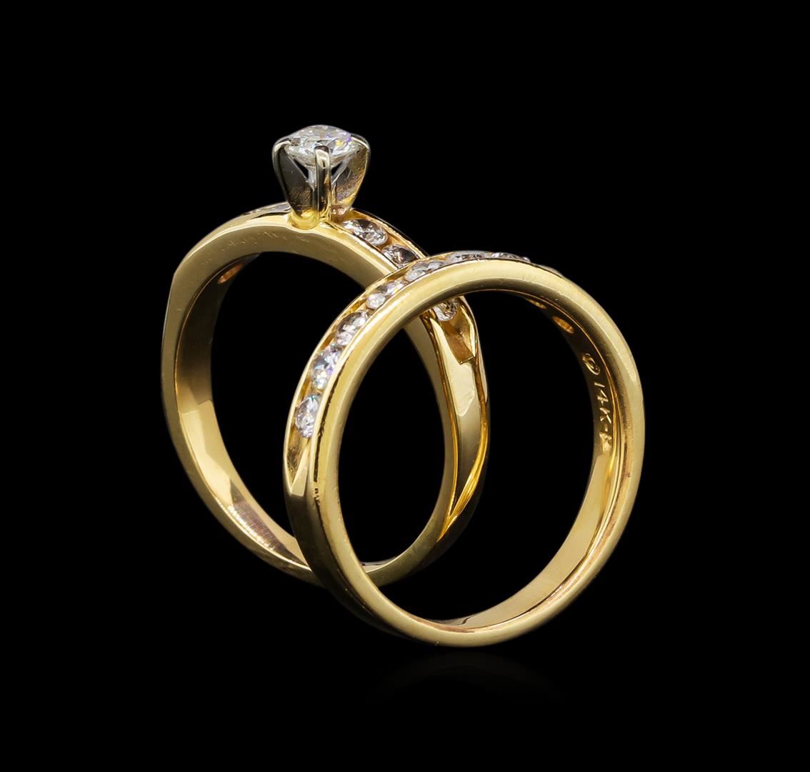 One set electronically tested 14KT yellow gold lady's cast wedding ring & wedding band with a bright polish finish. The featured lady's wedding set has a double shank measuring 5.45 millimeters wide. Identified with markings of '14KP'. Condition is used, good workmanship. Containing: One prong set round brilliant cut diamond, measuring 3.95 - 3.90 x 2.44mm (depth est.) approximate weight of 0.23ct. Graded in the setting. Clarity SI-2. Color: H Cut Good Six channel set round brilliant cut diamonds, measuring 2.60 - 2.50 x 1.58mm (depth est.) approximate total weight of 6 Stones = 0.38ct. Graded in the setting. Clarity SI-1 to SI-2. Color: H - I Cut Good Nine channel set round brilliant cut diamonds, measuring 2.50 - 2.40 x 1.52mm (depth est.) approximate total weight of 9 Stones = 0.50ct. Graded in the setting. Clarity SI-1 to I-1. Color: H - I Cut Good. Total Weight of Diamonds 1.11ct.. Total Weight of Ring & Wedding Band 5.80gm. GAS Appraised at $3,700.00.