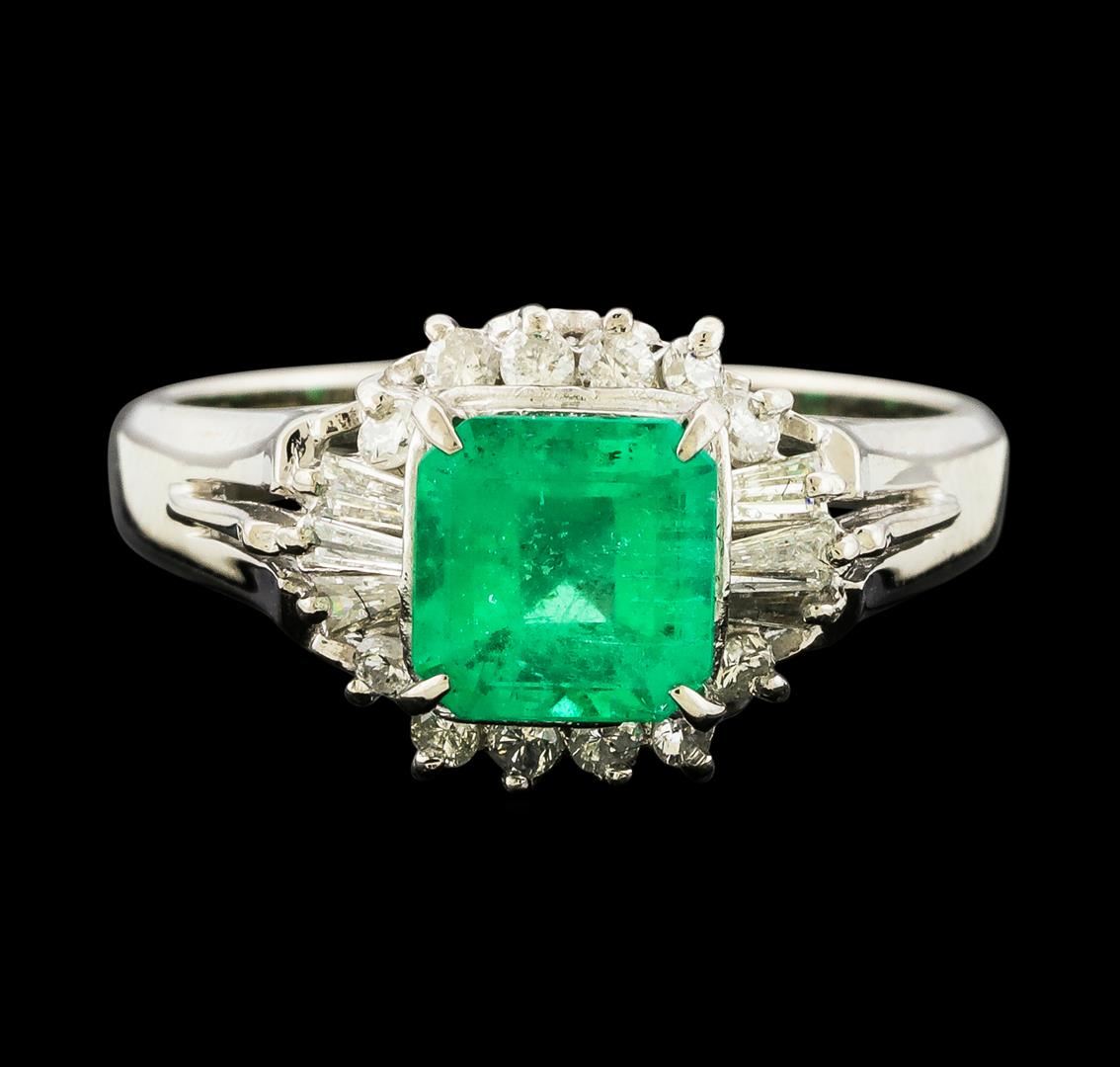 One ring featuring: Platinum containing Emerald with a total weight of 1.11ct and Diamonds with a total weight of 0.34ct. Total Weight of Ring: 6.2 grams.