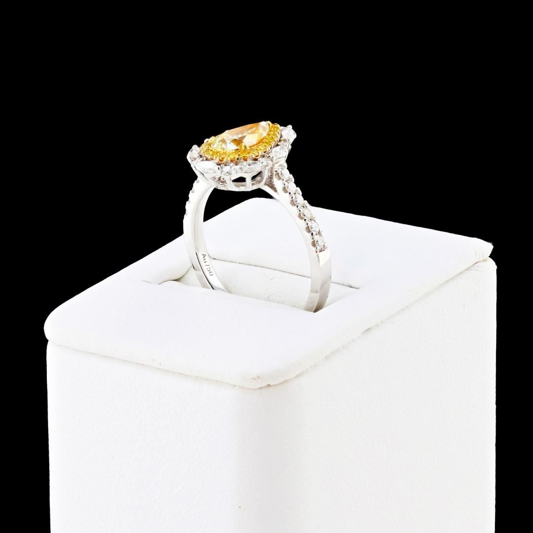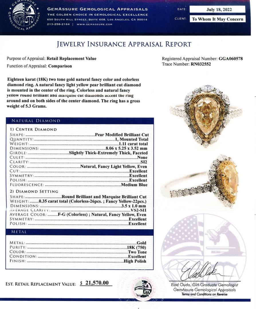 Eighteen karat (18K) two tone gold natural fancy color and colorless diamond ring. A natural fancy light yellow pear brilliant cut diamond is mounted in the center of the ring. Colorless and natural fancy yellow round brilliant and marquise cut diamonds accent the ring around and on both sides of the center diamond. The ring has a gross weight of 5.3 Grams. NATURAL DIAMOND 1) CENTER DIAMOND SHAPE: Pear Modified Brilliant Cut QUANTITY: 1, Mounted Total WEIGHT: 1.11 carat total DIMENSIONS: 8.06 x 5.25 x 3.52mm GIRDLE: Slightly Thick-Extremely Thick, Faceted CULET: None CLARITY: SI2 COLOR: Natural, Fancy Light Yellow, Even CUT: Excellent SYMMETRY: Excellent POLISH: Excellent FLUORESCENCE: Medium Blue 2) DIAMOND SETTING SHAPE: Round Brilliant and Marquise Brilliant Cut WEIGHT: 0.35 carat total (Colorless-26pcs. ; Fancy Yellow-22pcs.) DIMENSIONS: 3.5 x 1.0mm AVERAGE CLARITY: VS2 to SI1 AVERAGE COLOR: F - G (Colorless) ; Natural, Fancy Yellow, Even SYMMETRY: Excellent POLISH: Excellent METAL: Gold PURITY: 18K (750) COLOR: Two Tone CONDITION: Excellent FINISH: High Polish #Size: 6 1/2