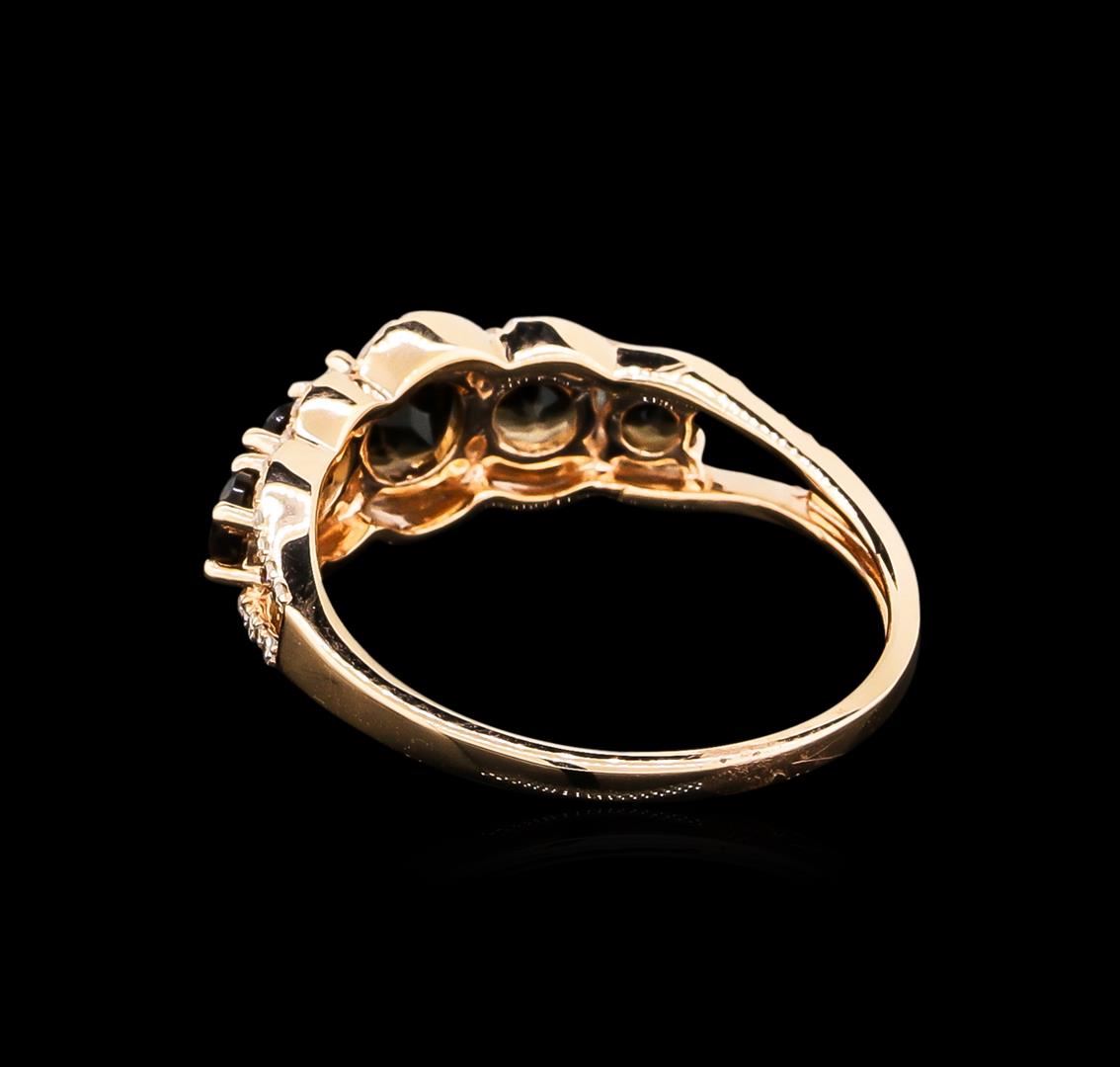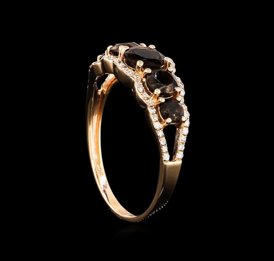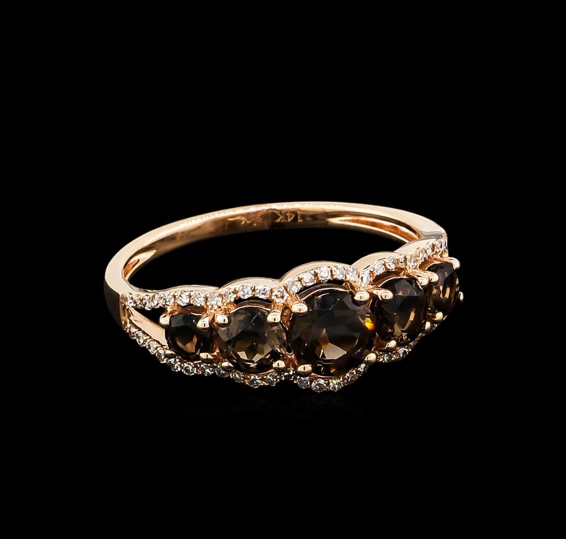 One ring featuring: 14KT rose gold weighing 2.40 grams containing five smokey topaz with a total weight of 1.11ct and side diamonds with a total weight of 0.17ct.