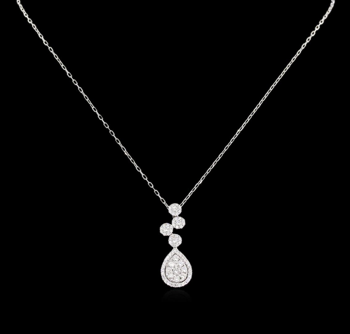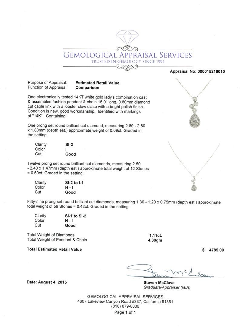 One electronically tested 14KT white gold lady's combination cast & assembled fashion pendant & chain 16.0" long, 0.80mm diamond cut cable link with a lobster claw clasp with a bright polish finish. Identified with markings of "14K". Condition is new, good workmanship. Containing: One prong set round brilliant cut diamond, measuring 2.80 - 2.80 x 1.80mm (depth est.) approximate weight of 0.09ct. Graded in the setting. Clarity SI-2 Color I. Cut Good Twelve prong set round brilliant cut diamonds, measuring 2.50 - 2.40 x 1.47mm (depth est.) approximate total weight of 12 Stones = 0.60ct. Graded in the setting. Clarity SI-2 to I-1 Color H - I. Cut Good Fifty-Nine prong set round brilliant cut diamonds, measuring 1.30 - 1.20 x 0.75mm (depth est.) approximate total weight of 59 Stones = 0.42ct. Graded in the setting. Clarity SI-1 to SI-2 Color H - I. Cut Good Total Weight of Diamonds 1.11ct. Total Weight of Pendant & Chain 4.30gm GAS Appraised at $4,785.00.