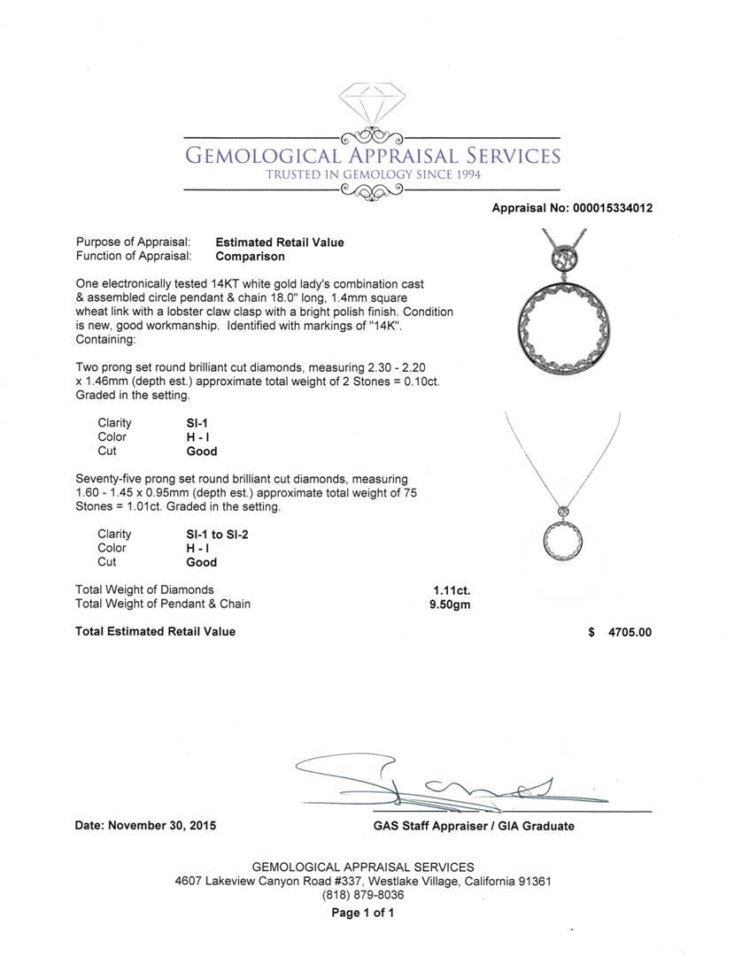 One electronically tested 14KT white gold lady's combination cast & assembled circle pendant & chain 18.0" long, 1.4mm square wheat link with a lobster claw clasp with a bright polish finish. Identified with markings of "14K". Condition is new, good workmanship. Containing: Two prong set round brilliant cut diamonds, measuring 2.30 - 2.20 x 1.46mm (depth est.) approximate total weight of 2 Stones = 0.10ct. Graded in the setting. Clarity: SI-1 . Color: H - I. Cut Good Seventy-Five prong set round brilliant cut diamonds, measuring 1.60 - 1.45 x 0.95mm (depth est.) approximate total weight of 75 Stones = 1.01ct. Graded in the setting. Clarity: SI-1 to SI-2 . Color: H - I. Cut Good. Total Weight of Diamonds 1.11ct.. Total Weight of Pendant & Chain 9.50gm at $ 4705.00 GAS Appraised.