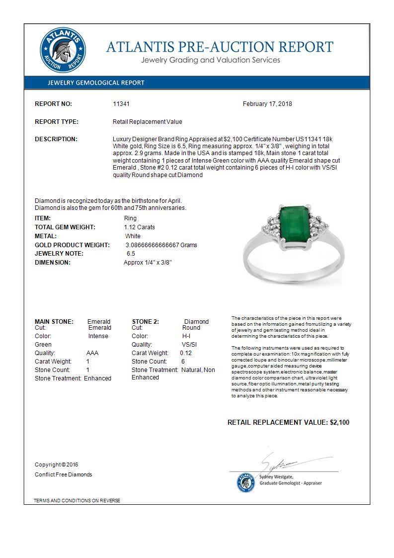 REF-31W8F -11341 ---- 1.12 CTW Emerald & Diamond Ring 18K White Gold ---- Luxury Designer Brand Ring Appraised at $2,100 Certificate Number US11341 18k White gold, Ring Size is 6.5, Ring measuring approx. 1/4" x 3/8" , weighing in total approx. 2.9 grams. Made in the USA and is stamped 18k, Main stone 1 carat total weight containing 1 pieces of Intense Green color with AAA quality Emerald shape cut Emerald , Stone #2 0.12 carat total weight containing 6 pieces of H-I color with VS/SI quality Round shape cut Diamond