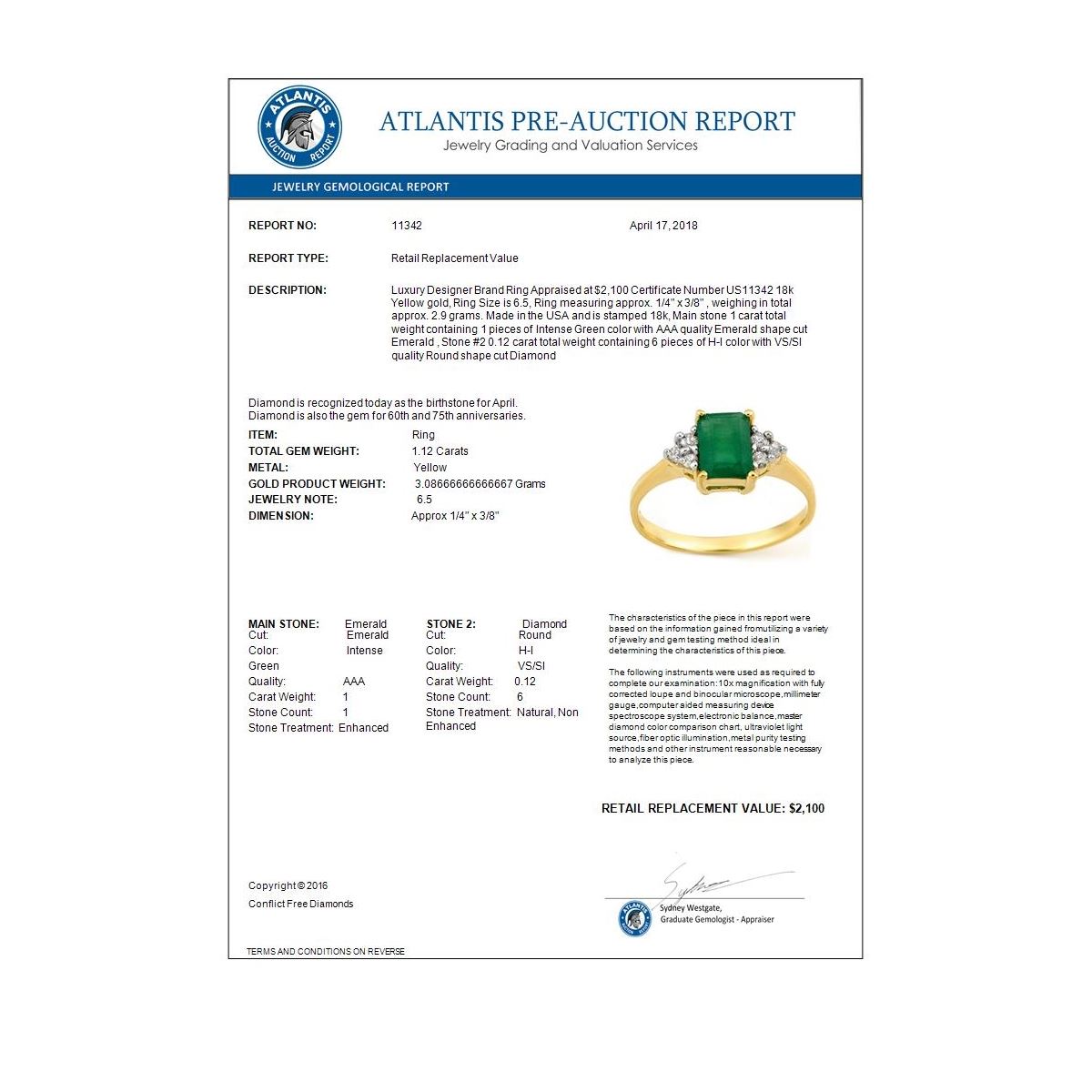 REF-31H8A -11342 ---- 1.12 CTW Emerald & Diamond Ring 18K Yellow Gold ---- Luxury Designer Brand Ring Appraised at $2,100 Certificate Number US11342 18k Yellow gold, Ring Size is 6.5, Ring measuring approx. 1/4" x 3/8" , weighing in total approx. 2.9 grams. Made in the USA and is stamped 18k, Main stone 1 carat total weight containing 1 pieces of Intense Green color with AAA quality Emerald shape cut Emerald , Stone #2 0.12 carat total weight containing 6 pieces of H-I color with VS/SI quality Round shape cut Diamond