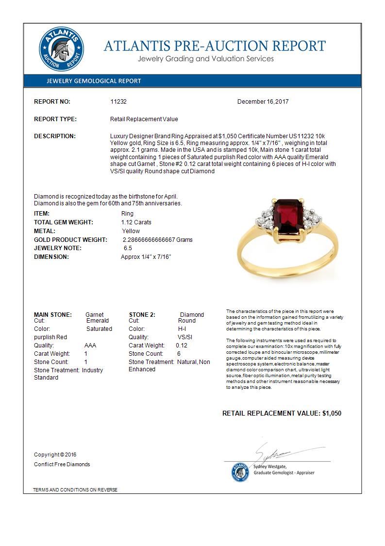 REF-17A5X -11232 ---- 1.12 CTW Garnet & Diamond Ring 10K Yellow Gold ---- Luxury Designer Brand Ring Appraised at $1,050 Certificate Number US11232 10k Yellow gold, Ring Size is 6.5, Ring measuring approx. 1/4" x 7/16" , weighing in total approx. 2.1 grams. Made in the USA and is stamped 10k, Main stone 1 carat total weight containing 1 pieces of Saturated purplish Red color with AAA quality Emerald shape cut Garnet , Stone #2 0.12 carat total weight containing 6 pieces of H-I color with VS/SI quality Round shape cut Diamond