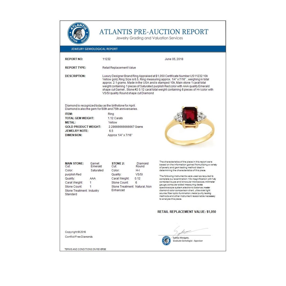 REF-17A5X -11232 ---- 1.12 CTW Garnet & Diamond Ring 10K Yellow Gold ---- Luxury Designer Brand Ring Appraised at $1,050 Certificate Number US11232 10k Yellow gold, Ring Size is 6.5, Ring measuring approx. 1/4" x 7/16" , weighing in total approx. 2.1 grams. Made in the USA and is stamped 10k, Main stone 1 carat total weight containing 1 pieces of Saturated purplish Red color with AAA quality Emerald shape cut Garnet , Stone #2 0.12 carat total weight containing 6 pieces of H-I color with VS/SI quality Round shape cut Diamond