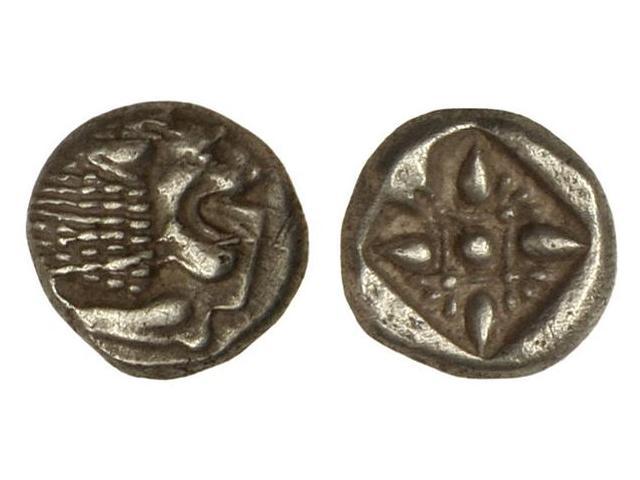 1/12 Estátera. - Siglo VI a.C. - MILETOS. - Anv.: Cabeza de león a derecha. Rev.: Estrella ornamental dentro de cuadro incuso. 1,10 grs. AR. Se-3533. EBC-. - -