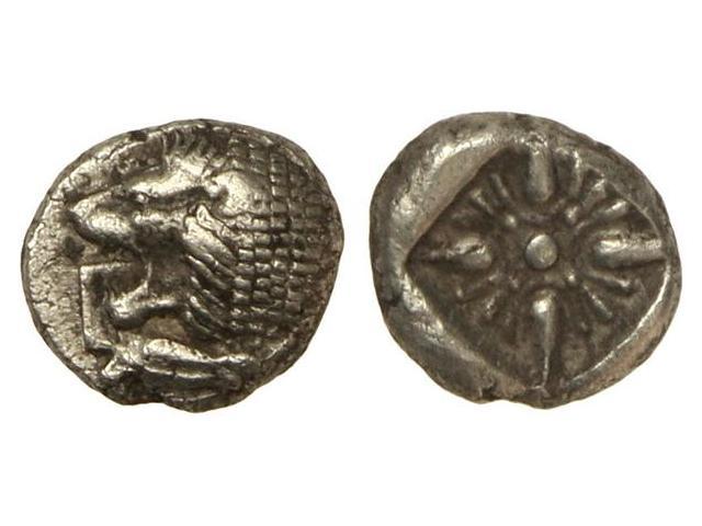 1/12 Estátera. - Siglo VI a.C. - MILETOS. - Anv.: Cabeza de león a izquierda. Rev.: Estrella ornamental dentro de cuadro incuso. 1,20 grs. AR. Se-3532. EBC/EBC-. - -