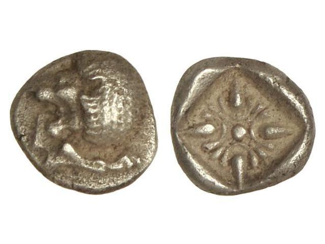 1/12 Estátera. Siglo VI a.C. MILETOS. Anv.: Mitad de león a izquierda. Rev.: Estrella ornamental en cuadro incuso. 0,90 grs. AR. Se-3532. MBC+.
