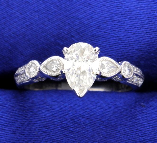 Beautiful 1.12 carat diamond engagement ring. The pear diamond center is 0.81 carat SI1 clarity and I color. The mounting is 14k white gold with 0.31 carats of brilliant cut diamonds. This is a new mounting by "Cordova." There are two small pear shapes bezel set into the band. Size 6 1/2 3.5g
