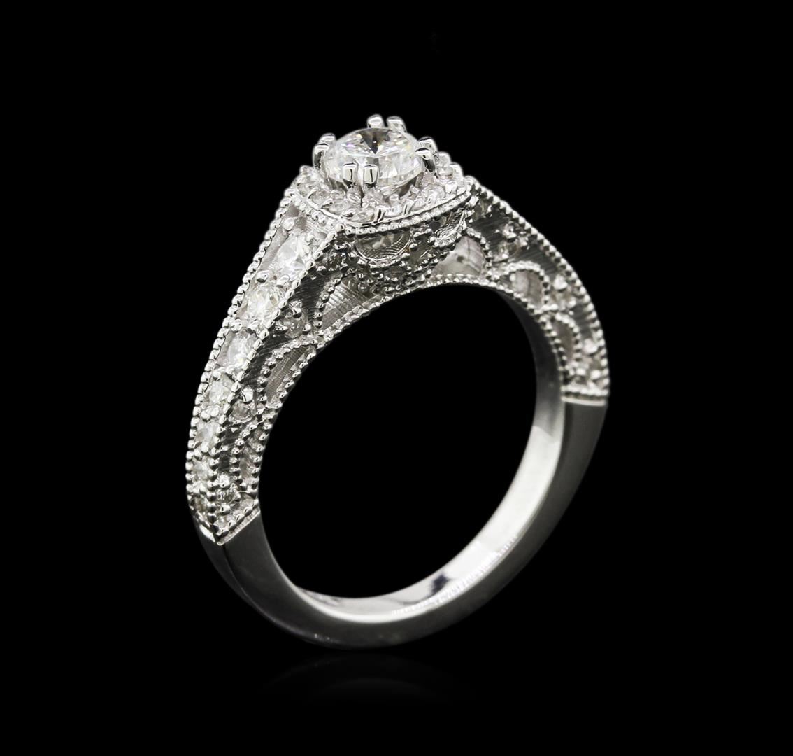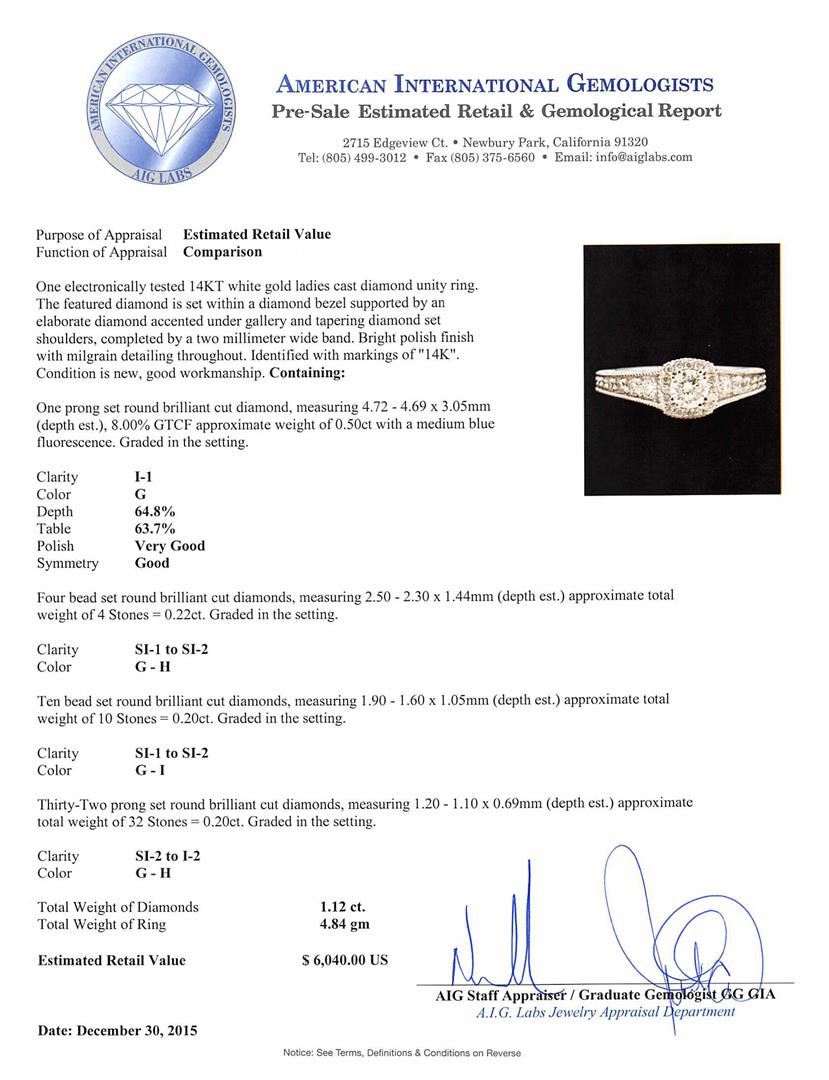 One prong set round brilliant cut diamond, measuring 4.72 - 4.69 x 3.05mm (depth est.), 8.00.%. GTCF approximate weight of 0.50ct with a medium blue fluorescence. Graded in the setting. Clarity: I-1. Color: 64.8%. Table 63.7%. Four bead set round brilliant cut diamonds, measuring 2.50 - 2.30 x 1.44mm (depth est.) approximate total weight of 4 Stones = 0.22ct. Graded in the setting. Clarity: SI-1 to SI-2. Color: G - H Ten bead set round brilliant cut diamonds, measuring 1.90 - 1.60 x 1.05mm (depth est.) approximate total weight of 10 Stones = 0.20ct. Graded in the setting. Clarity: SI-1 to SI-2. Color: G - I Thirty-Two prong set round brilliant cut diamonds, measuring 1.20 - 1.10 x 0.69mm (depth est.) approximate total weight of 32 Stones = 0.20ct. Graded in the setting. Clarity: SI-2 to I-2. Color: G - H. Total Weight of Diamonds 1.12ct. Total Weight of Ring 4.84gm. AIG Appraised at $6,040.00.