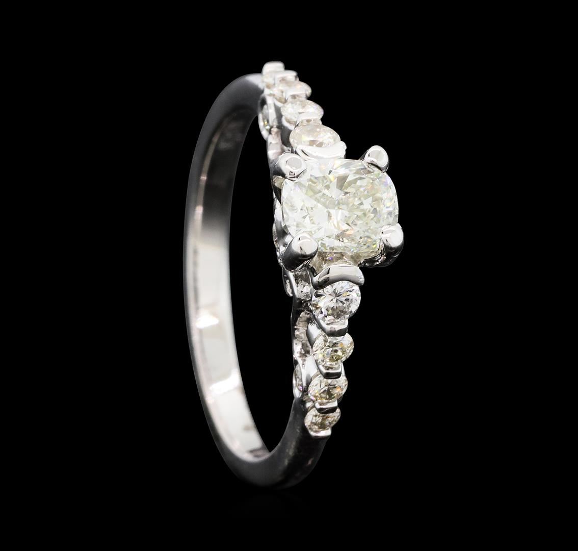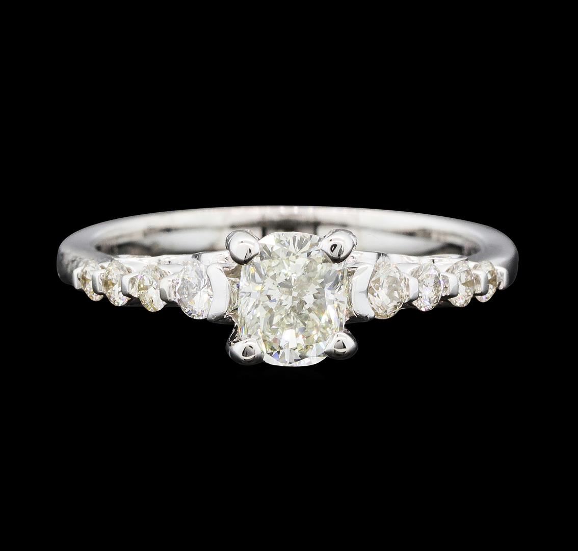 One electronically tested 14KT white gold lady's cast wedding ring with a cathedral shank with a bright polish finish. The featured lady's ring has a scrolled under gallery and a shank measuring 2.00 millimeters wide. Identified with markings of '14K'. Condition is new, good workmanship. Containing: One prong set cushion cut diamond, measuring 5.67 x 4.59 x 3.21mm (depth est.) , 5.00.%. GTCF approximate weight of 0.76ct. Graded in the setting. Color I - J Clarity SI-1 Cut Good Two prong set round brilliant cut diamonds, measuring 2.40 - 2.35 x 1.48mm (depth est.) approximate total weight of 2 Stones = 0.11ct. Graded in the setting. Color I - J Clarity SI-1 to SI-2 Cut Good Twelve prong set round brilliant cut diamonds, measuring 2.00 - 1.50 x 1.09mm (depth est.) approximate total weight of 12 Stones = 0.25ct. Graded in the setting. Color I - J Clarity SI-1 to SI-2 Cut Very Good. Total Weight of Diamonds 1.12ct.. Total Weight of Ring 3.00gm GAS Appraised at $6,130.00.
