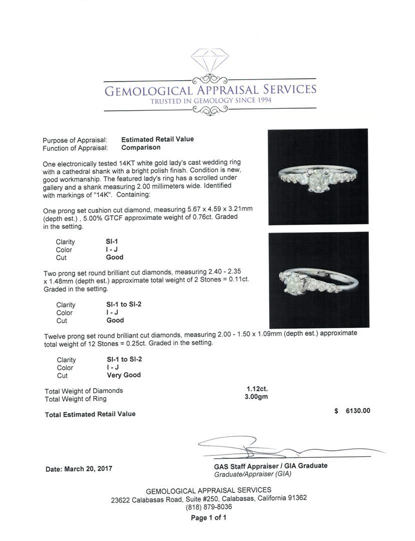 One electronically tested 14KT white gold lady's cast wedding ring with a cathedral shank with a bright polish finish. The featured lady's ring has a scrolled under gallery and a shank measuring 2.00 millimeters wide. Identified with markings of '14K'. Condition is new, good workmanship. Containing: One prong set cushion cut diamond, measuring 5.67 x 4.59 x 3.21mm (depth est.) , 5.00.%. GTCF approximate weight of 0.76ct. Graded in the setting. Color I - J Clarity SI-1 Cut Good Two prong set round brilliant cut diamonds, measuring 2.40 - 2.35 x 1.48mm (depth est.) approximate total weight of 2 Stones = 0.11ct. Graded in the setting. Color I - J Clarity SI-1 to SI-2 Cut Good Twelve prong set round brilliant cut diamonds, measuring 2.00 - 1.50 x 1.09mm (depth est.) approximate total weight of 12 Stones = 0.25ct. Graded in the setting. Color I - J Clarity SI-1 to SI-2 Cut Very Good. Total Weight of Diamonds 1.12ct.. Total Weight of Ring 3.00gm GAS Appraised at $6,130.00.