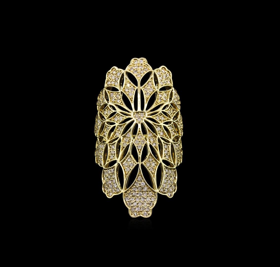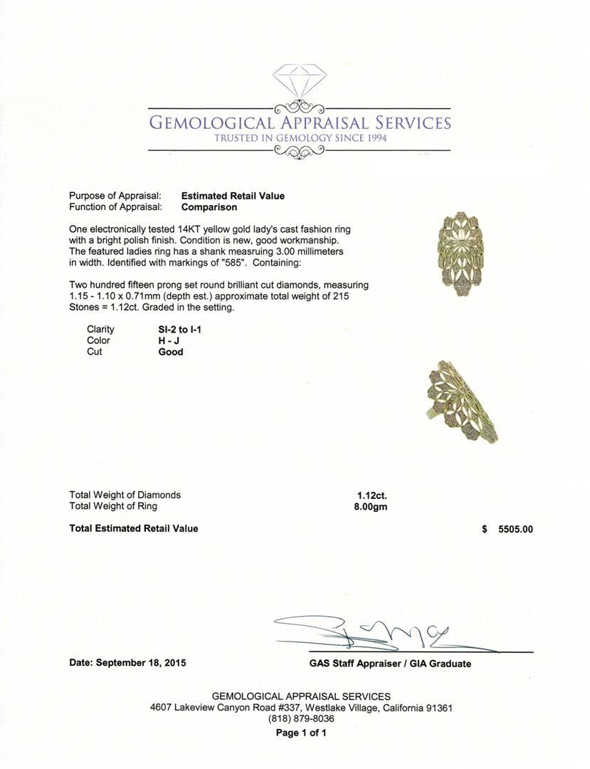 One electronically tested 14KT yellow gold lady's cast fashion ring with a bright polish finish. The featured ladies ring has a shank measuring 3.00 millimeters in width. Identified with markings of "585". Condition is new, good workmanship. Containing: Two Hundred Fifteen prong set round brilliant cut diamonds, measuring 1.15 - 1.10 x 0.71mm (depth est.) approximate total weight of 215 Stones = 1.12ct. Graded in the setting. Clarity: SI-2 to I-1. Color: H - Good. Total Weight of Diamonds 1.12ct. Total Weight of Ring 8.00gm. GAS Appraised at $5,505.00.