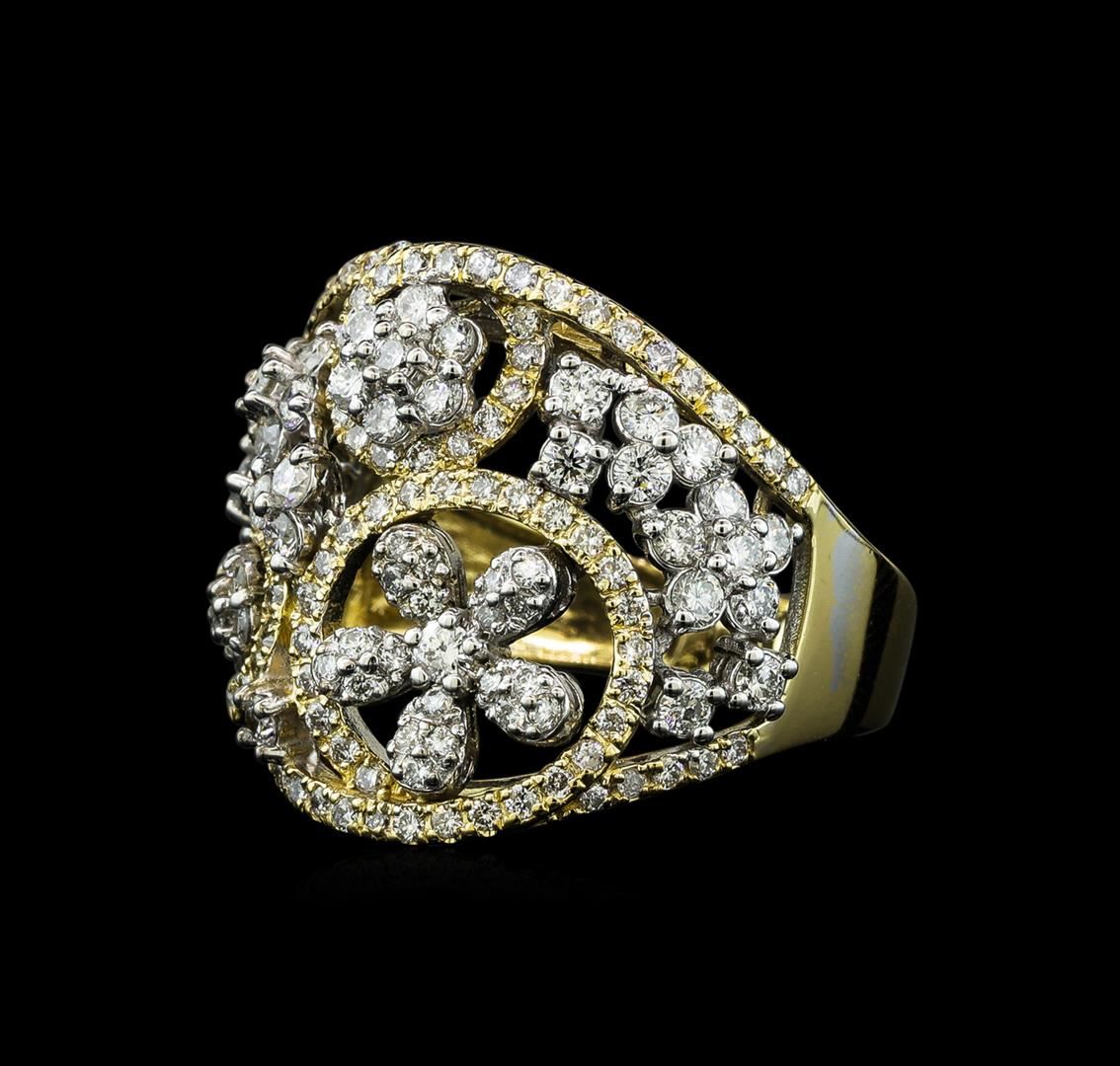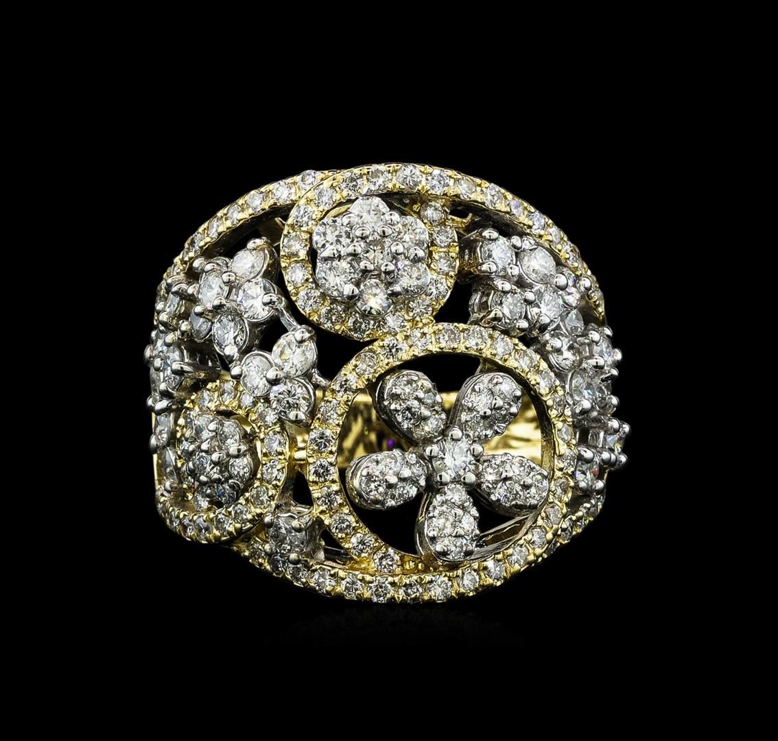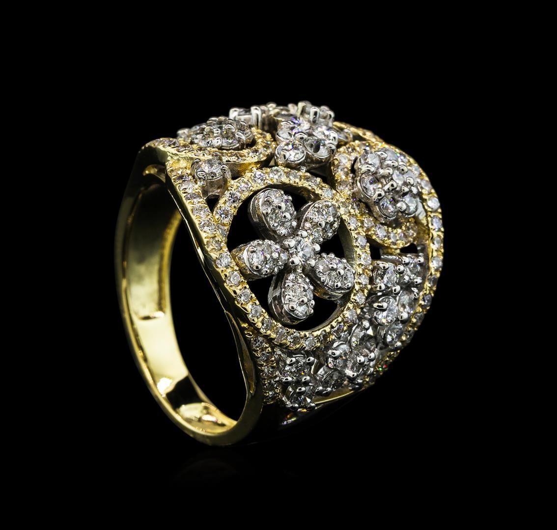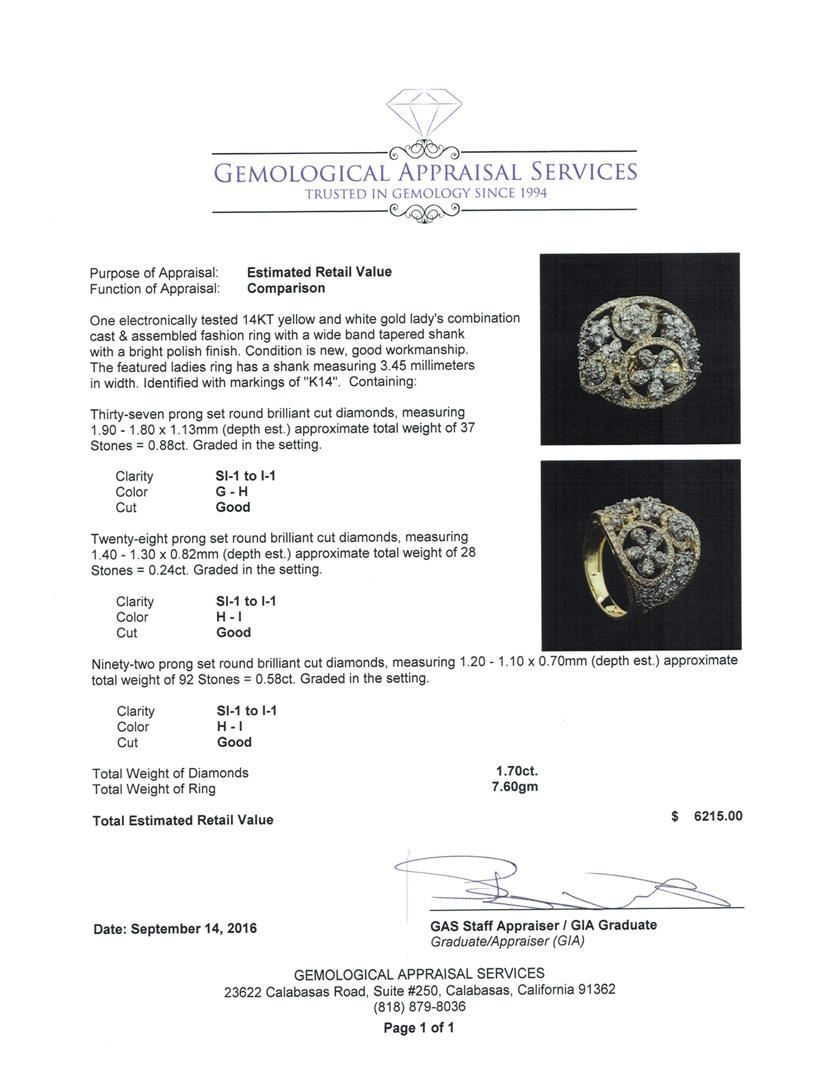 One electronically tested 14KT yellow and white gold lady's combination cast & assembled fashion ring with a wide band tapered shank with a bright polish finish. The featured ladies ring has a shank measuring 3.45 millimeters in width. Identified with markings of 'K14'. Condition is new, good workmanship. Containing: Thirty-Seven prong set round brilliant cut diamonds, measuring 1.90 - 1.80 x 1.13mm (depth est.) approximate total weight of 37 Stones = 0.88ct. Graded in the setting. Clarity SI-1 to I-1. Color: G - H Cut Good Twenty-Eight prong set round brilliant cut diamonds, measuring 1.40 - 1.30 x 0.82mm (depth est.) approximate total weight of 28 Stones = 0.24ct. Graded in the setting. Clarity SI-1 to I-1. Color: H - I Cut Good Ninety-Two prong set round brilliant cut diamonds, measuring 1.20 - 1.10 x 0.70mm (depth est.) approximate total weight of 92 Stones = 0.58ct. Graded in the setting. Clarity SI-1 to I-1. Color: H - I Cut Good. Total Weight of Diamonds 1.70ct.. Total Weight of Ring 7.60gm GAS Appraised at $6,215.00.