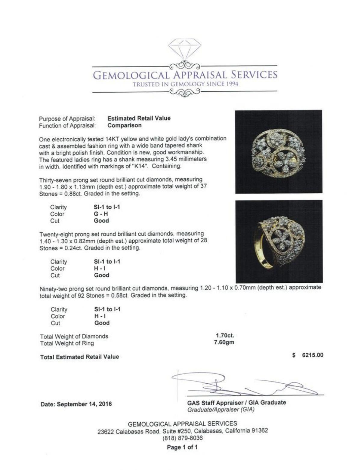 One electronically tested 14KT yellow and white gold lady's combination cast & assembled fashion ring with a wide band tapered shank with a bright polish finish. The featured ladies ring has a shank measuring 3.45 millimeters in width. Identified with markings of 'K14'. Condition is new, good workmanship. Containing: Thirty-Seven prong set round brilliant cut diamonds, measuring 1.90 - 1.80 x 1.13mm (depth est.) approximate total weight of 37 Stones = 0.88ct. Graded in the setting. Clarity SI-1 to I-1. Color: G - H Cut Good Twenty-Eight prong set round brilliant cut diamonds, measuring 1.40 - 1.30 x 0.82mm (depth est.) approximate total weight of 28 Stones = 0.24ct. Graded in the setting. Clarity SI-1 to I-1. Color: H - I Cut Good Ninety-Two prong set round brilliant cut diamonds, measuring 1.20 - 1.10 x 0.70mm (depth est.) approximate total weight of 92 Stones = 0.58ct. Graded in the setting. Clarity SI-1 to I-1. Color: H - I Cut Good. Total Weight of Diamonds 1.70ct.. Total Weight of Ring 7.60gm GAS Appraised.