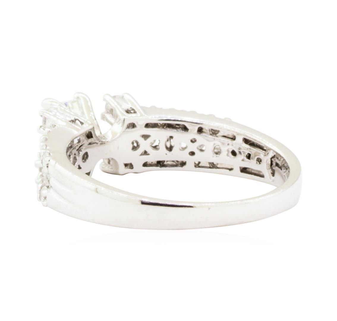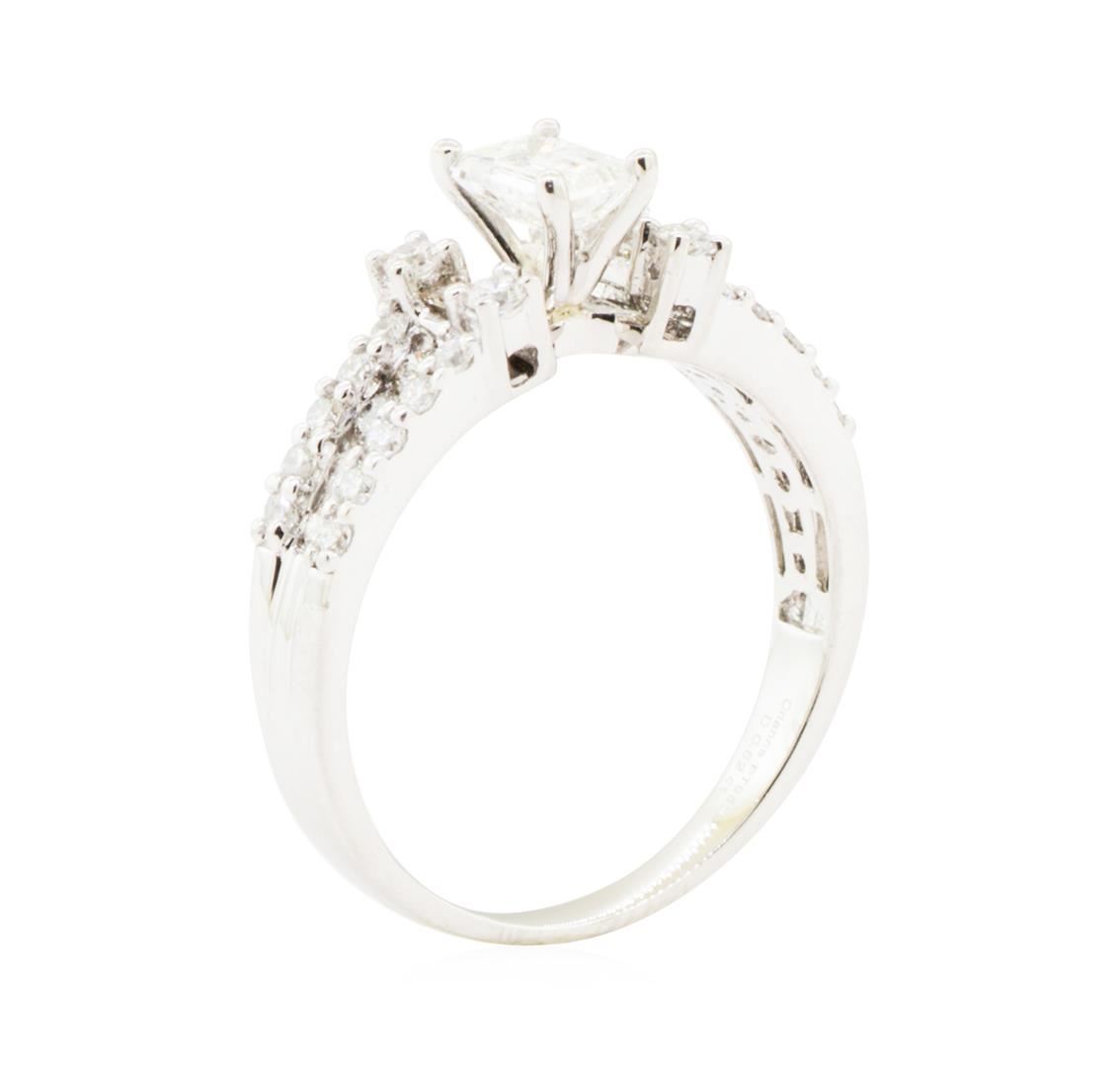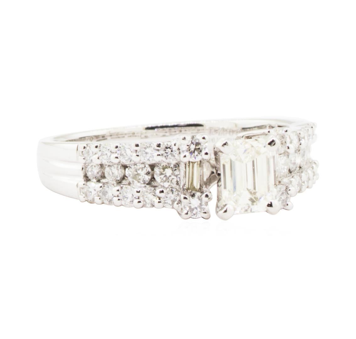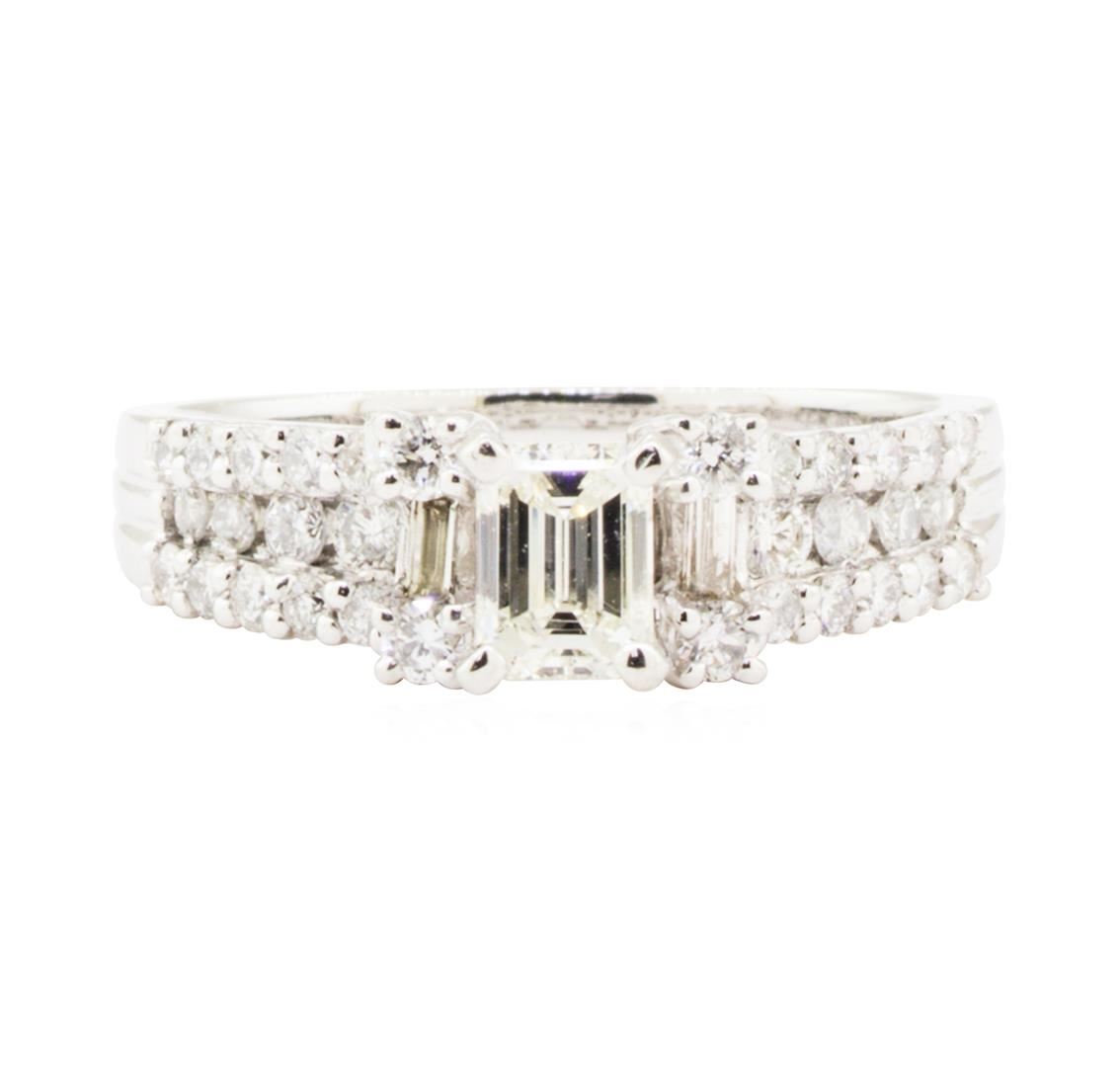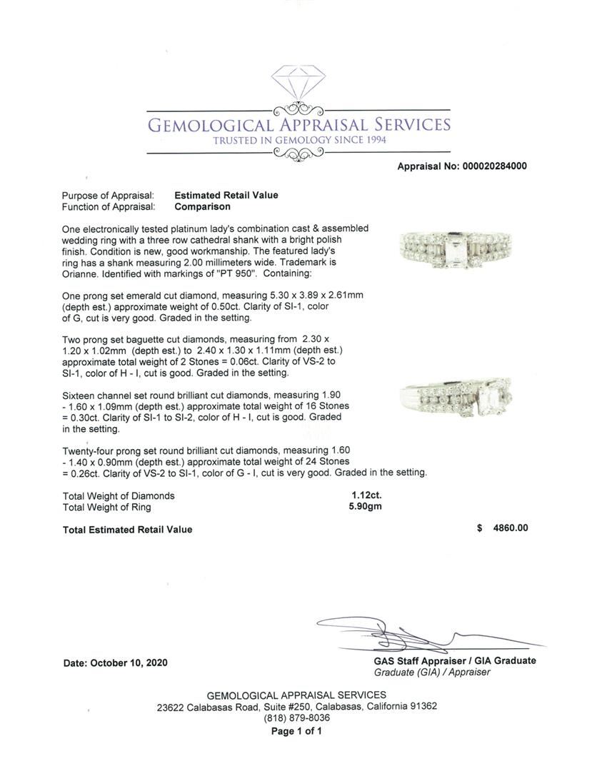 One electronically tested platinum lady's combination cast & assembled wedding ring with a three row cathedral shank with a bright polish finish. The featured lady's ring has a shank measuring 2.00 millimeters wide. Trademark is Orianne. Identified with markings of 'PT 950'. Condition is new, good workmanship. Containing: One prong set emerald cut diamond, measuring 5.30 x 3.89 x 2.61mm (depth est.) approximate weight of 0.50ct. Graded in the setting. Color G Clarity SI-1 Cut Very Good Two prong set baguette cut diamonds, measuring from 2.30 x 1.20 x 1.02mm (depth est.) to 2.40 x 1.30 x 1.11mm (depth est.) approximate total weight of 2 Stones = 0.06ct. Graded in the setting. Color H - I Clarity VS-2 to SI-1 Cut Good Sixteen channel set round brilliant cut diamonds, measuring 1.90 - 1.60 x 1.09mm (depth est.) approximate total weight of 16 Stones = 0.30ct. Graded in the setting. Color H - I Clarity SI-1 to SI-2 Cut Good Twenty-Four prong set round brilliant cut diamonds, measuring 1.60 - 1.40 x 0.90mm (depth est.) approximate total weight of 24 Stones = 0.26ct. Graded in the setting. Color G - I Clarity VS-2 to SI-1 Cut Very Good. Total Weight of Diamonds 1.12ct.. Total Weight of Ring 5.90gm GAS Appraised at $4860.00. GAS Appraised.