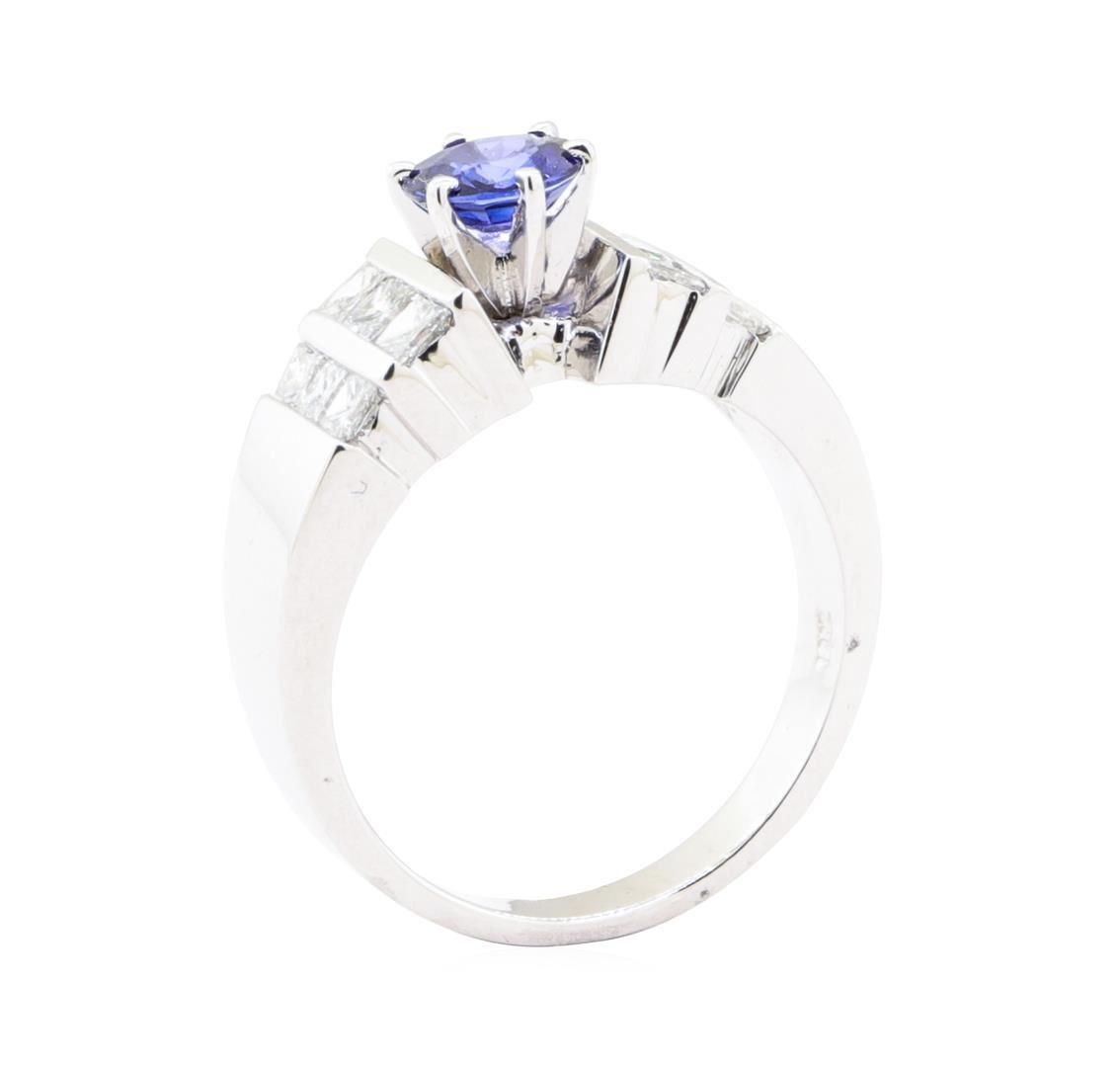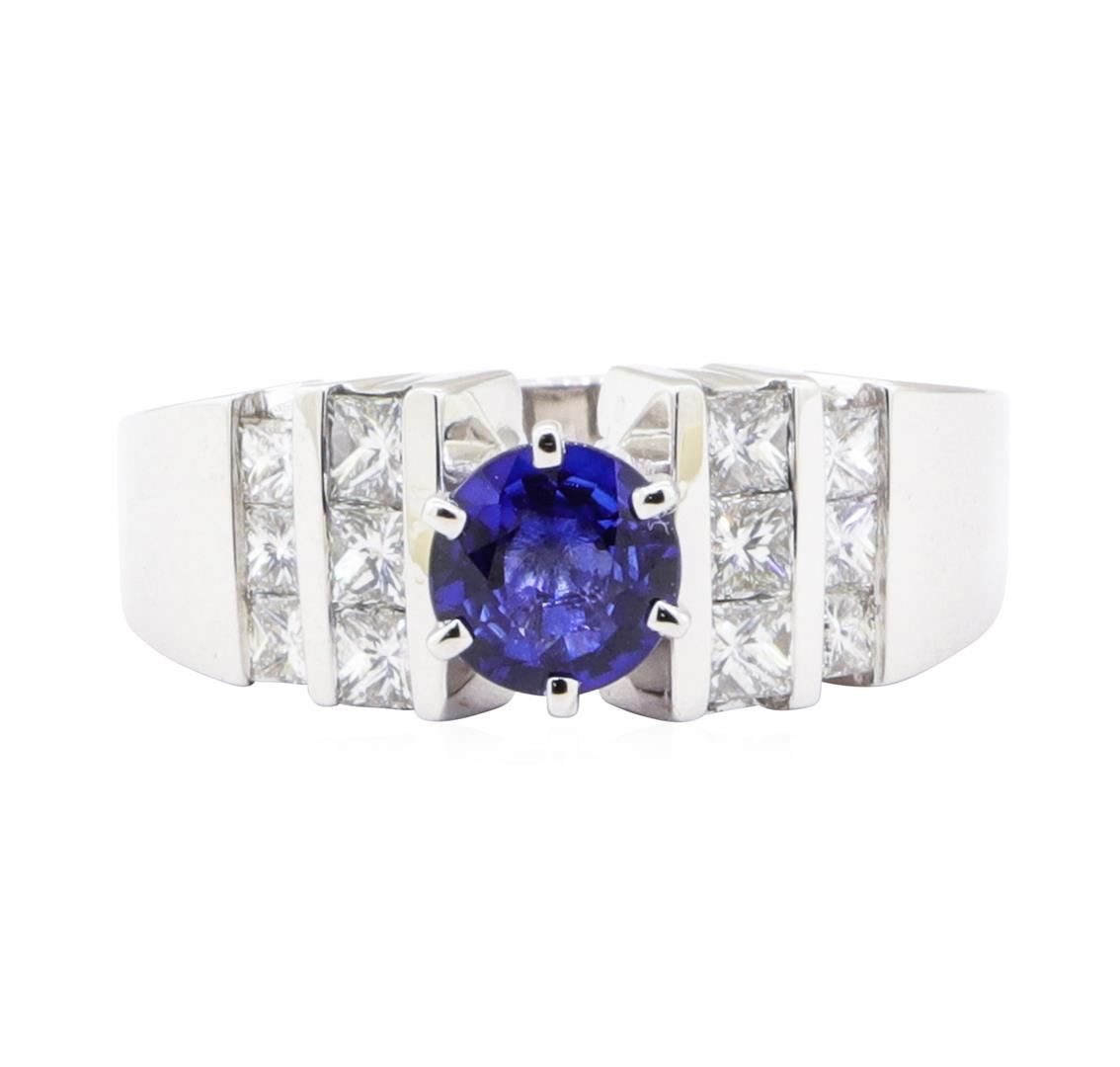 One electronically tested 14KT white gold lady's combination cast & assembled fashion ring with a cathedral shank with a bright polish finish. The featured lady's ring has a shank measuring 3.10 millimeters wide. Identified with markings of '14K'. Condition is new, good workmanship. Containing: One prong set round modified mixed cut natural blue sapphire, measuring 5.61 - 5.50 x 2.70 mm, (depth est.) approximate weight of 0.68ct., clarity is eye clean, medium, moderately strong, blue color, (GIA B 5/4), cut is good. Transmitting light with no distortion, transparent. Colored gemstones are presumed to have been subjected to commonly used enhancement processes. Graded in the setting. Six channel set round brilliant cut diamonds, measuring 2.30 - 2.20 x 1.40mm (depth est.) approximate total weight of 6 Stones = 0.26ct. Graded in the setting. Color H - I Clarity VS-1 to VS-2 Cut Very Good Six channel set round brilliant cut diamonds, measuring 2.00 - 1.95 x 1.23mm (depth est.) approximate total weight of 6 Stones = 0.18ct. Graded in the setting. Color H - I Clarity VS-2 to SI-1 Cut Good. Total Weight of Colored Stones 0.68ct.. Total Weight of Diamonds 0.44ct.. Total Weight of Ring 6.30gm GAS Appraised at $2905.00. GAS Appraised.