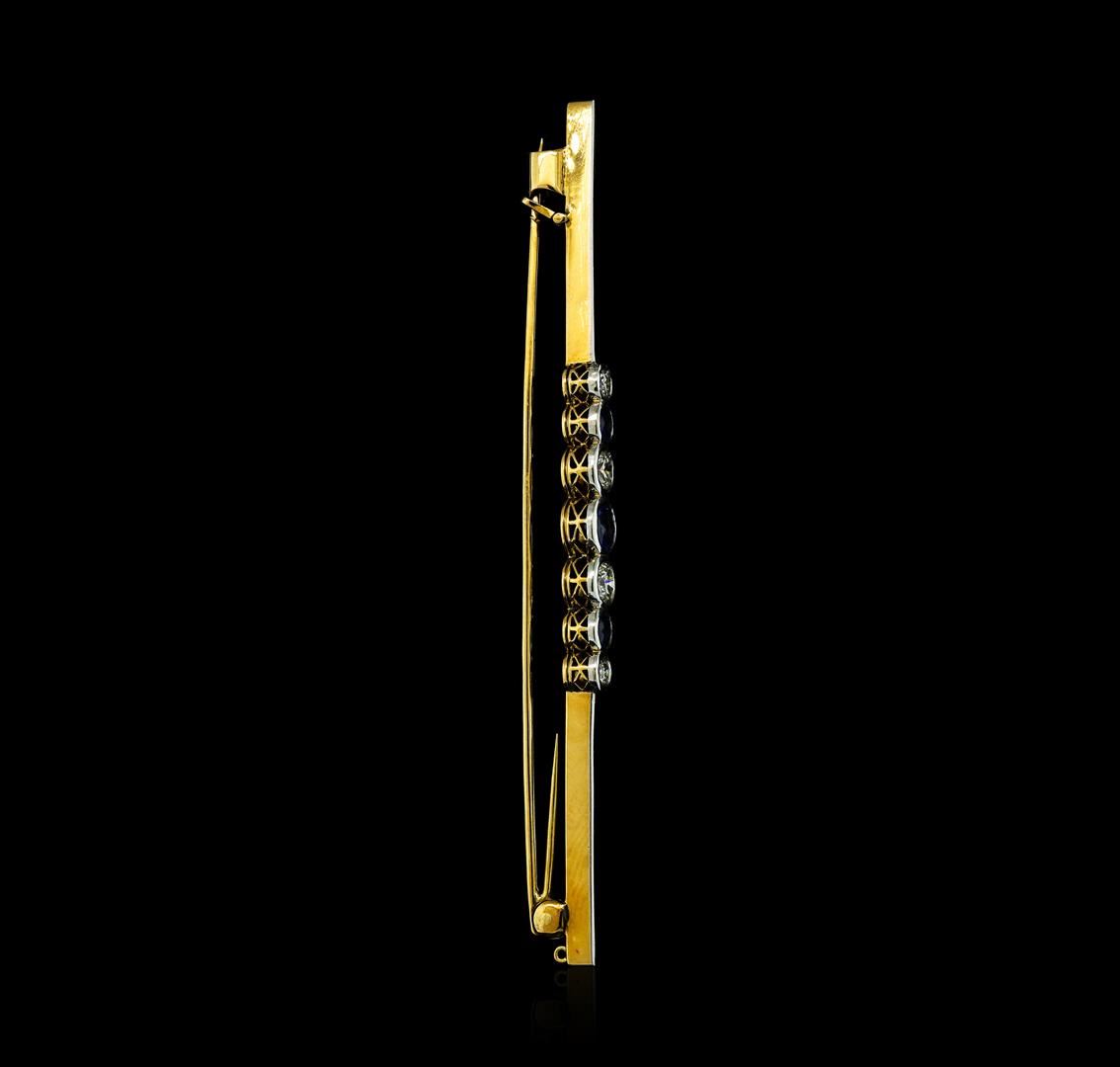 One electronically tested 14KT yellow gold ladies cast & assembled sapphire and diamond brooch. The brooch features a series of graduating sapphires and diamonds set between elongated beams, completed by a vertically/ horizontally placed pin. The brooch measures three and one-half inches in length. Bright polish finish with rhodium accents. Identified with markings of '585'. Condition is good. Containing: Three bezel set round mixed cut natural blue sapphires approximate total weight of 1.12ct., clarity is eye clean, type II, medium dark, very slightly grayish, blue color, (GIA B 6/3), cut is good. Transmitting light with no distortion, transparent. Color grade is an average for the group. Graded in the setting. Two bezel set round brilliant cut diamonds, measuring 4.30 - 4.30 x 2.85mm (depth est.) approximate total weight of 2 Stones = 0.64ct. Graded in the setting. Clarity SI-2 to I-1. Color: J - K Two bezel set round brilliant cut diamonds, measuring 3.00 - 3.00 x 1.90mm (depth est.) approximate total weight of 2 Stones = 0.20ct. Graded in the setting. Clarity SI-1 to SI-2. Color: G - H. Total Weight of Colored Stones 1.12ct.. Total Weight of Diamonds 0.84ct.. Total Weight of Brooch 10.71gm. AIG Appraised.