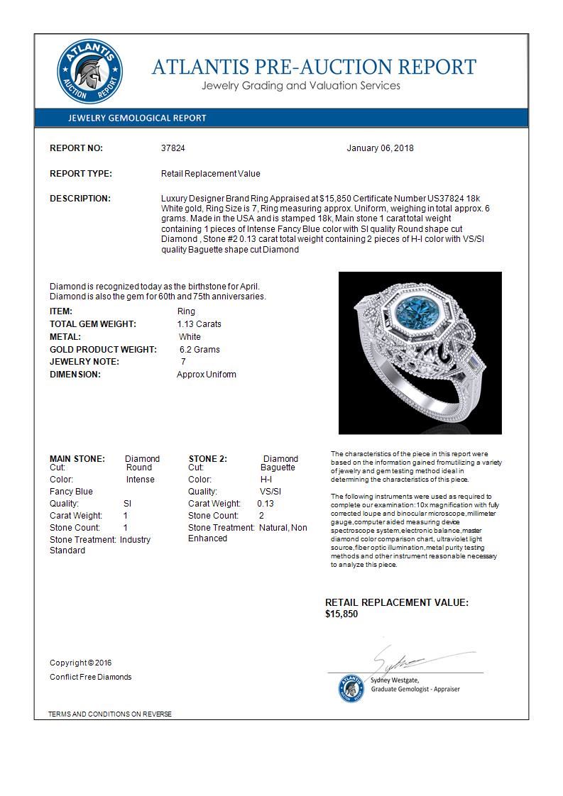 REF-240W2F -37824 ---- 1.13 CTW Fancy Intense Blue Diamond Solitaire Art Deco Ring 18K White Gold ---- Luxury Designer Brand Ring Appraised at $15,850 Certificate Number US37824 18k White gold, Ring Size is 7, Ring measuring approx. Uniform, weighing in total approx. 6 grams. Made in the USA and is stamped 18k, Main stone 1 carat total weight containing 1 pieces of Intense Fancy Blue color with SI quality Round shape cut Diamond , Stone #2 0.13 carat total weight containing 2 pieces of H-I color with VS/SI quality Baguette shape cut Diamond