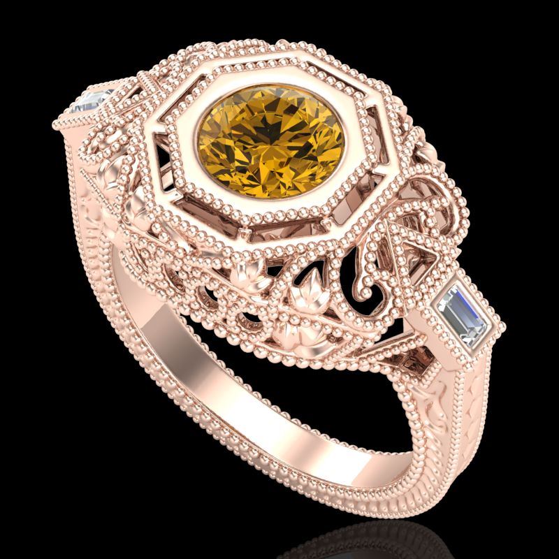REF-309A3X -37827 ---- 1.13 CTW Intense Fancy Yellow Diamond Engagement Art Deco Ring 18K Rose Gold ---- Luxury Designer Brand Ring Appraised at $18,700 Certificate Number US37827 18k Rose gold, Ring Size is 7, Ring measuring approx. Uniform, weighing in total approx. 6 grams. Made in the USA and is stamped 18k, Main stone 1 carat total weight containing 1 pieces of Intense Fancy Yellow color with SI quality Round shape cut Diamond , Stone #2 0.13 carat total weight containing 2 pieces of H-I color with VS/SI quality Baguette shape cut Diamond