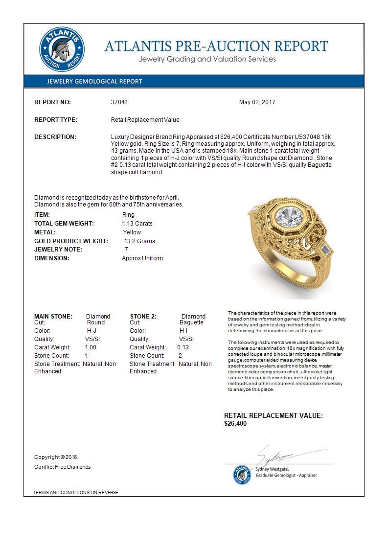 1.13 CTW VS/SI Diamond Solitaire Art Deco Ring 18K Yellow Gold ---- Luxury Designer Brand Ring Appraised Retail Price at $26,400 ---- SKU Number US37048 18k Yellow gold Ring Size is 7, Ring measuring approx. Uniform, weighing in total approx. 13 grams. Made in the USA and is stamped 18k, Main stone 1.00 carat total weight containing 1 pieces of H-J color with VS/SI quality Round shape cut Diamond , Stone #2 0.13 carat total weight containing 2 pieces of H-I color with VS/SI quality Baguette shape cut