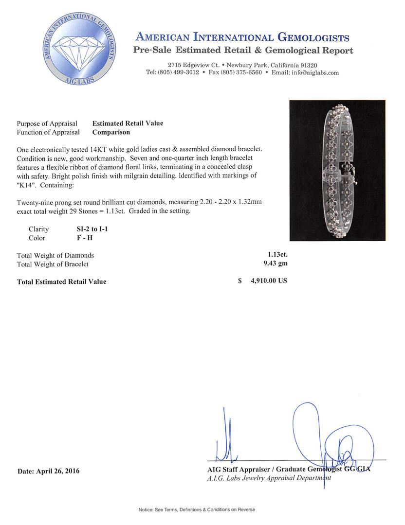 One electronically tested 14KT white gold ladies cast & assembled diamond bracelet. Seven and one-quarter inch length bracelet features a flexible ribbon of diamond floral links, terminating in a concealed clasp with safety. Bright polish finish with milgrain detailing. Identified with markings of "K14". Condition is new, good workmanship. Containing: Twenty-Nine prong set round brilliant cut diamonds, measuring 2.20 - 2.20 x 1.32mm exact total weight 29 Stones = 1.13ct. Graded in the setting. Clarity: SI-2 to I-1. Color: F - H. Total Weight of Diamonds 1.13ct. Total Weight of Bracelet 9.43gm. AIG Appraised at $4,910.00.