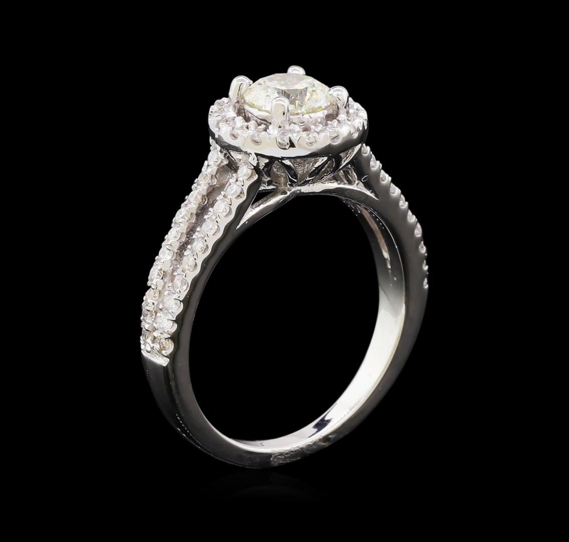 One electronically tested 14KT white gold lady's cast wedding ring with a split shank basket halo with a bright polish finish. The featured lady's ring has a shank measuring 1.85 millimeters wide. Identified with markings of "14K". Condition is new, good workmanship. Containing: One prong set round brilliant cut diamond, measuring 5.81 - 5.71 x 3.57mm (depth est.) approximate weight of 0.73ct. Graded in the setting. Clarity: I-1. Color: H - I. Cut Very Good Fifty-Eight prong set round brilliant cut diamonds, measuring 1.30 - 1.20 x 0.75mm (depth est.) approximate total weight of 58 Stones = 0.40ct. Graded in the setting. Clarity: SI-2 to I-1. Color: H - I. Cut Good. Total Weight of Diamonds 1.13ct. Total Weight of Ring 4.90gm. GAS Appraised at $6,135.00.