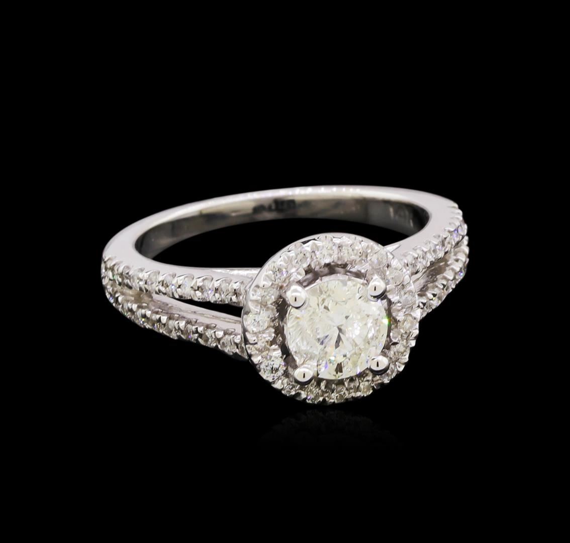 One electronically tested 14KT white gold lady's cast wedding ring with a split shank basket halo with a bright polish finish. The featured lady's ring has a shank measuring 1.85 millimeters wide. Identified with markings of "14K". Condition is new, good workmanship. Containing: One prong set round brilliant cut diamond, measuring 5.81 - 5.71 x 3.57mm (depth est.) approximate weight of 0.73ct. Graded in the setting. Clarity: I-1. Color: H - I. Cut Very Good Fifty-Eight prong set round brilliant cut diamonds, measuring 1.30 - 1.20 x 0.75mm (depth est.) approximate total weight of 58 Stones = 0.40ct. Graded in the setting. Clarity: SI-2 to I-1. Color: H - I. Cut Good. Total Weight of Diamonds 1.13ct. Total Weight of Ring 4.90gm. GAS Appraised at $6,135.00.