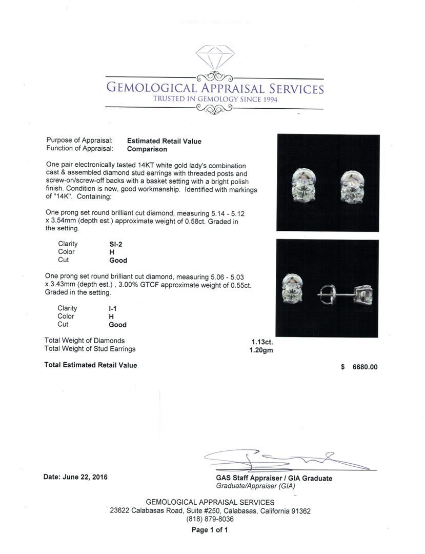 One pair electronically tested 14KT white gold lady's combination cast & assembled diamond stud earrings with threaded posts and screw-on/screw-off backs with a basket setting with a bright polish finish. Identified with markings of "14K". Condition is new, good workmanship. Containing: One prong set round brilliant cut diamond, measuring 5.14 - 5.12 x 3.54mm (depth est.) approximate weight of 0.58ct. Graded in the setting. Clarity: SI-2. Color: H. Cut Good One prong set round brilliant cut diamond, measuring 5.06 - 5.03 x 3.43mm (depth est.) , 3.00.%. GTCF approximate weight of 0.55ct. Graded in the setting. Clarity: I-1. Color: Good. Total Weight of Diamonds 1.13ct. Total Weight of Stud Earrings 1.20gm. GAS Appraised at $6,680.00.