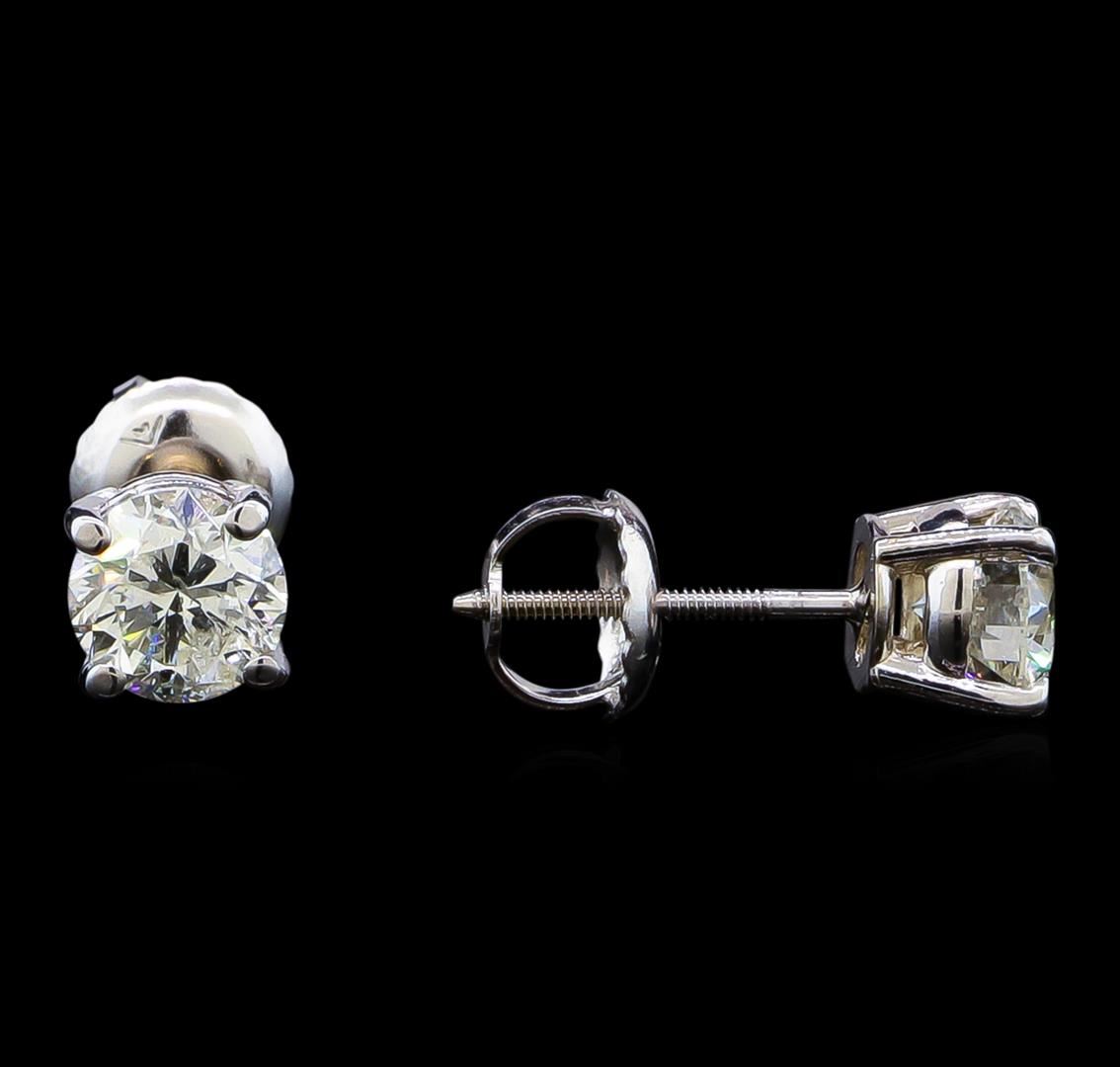 One pair electronically tested 14KT white gold lady's combination cast & assembled diamond stud earrings with threaded posts and screw-on/screw-off backs with a basket setting with a bright polish finish. Identified with markings of "14K". Condition is new, good workmanship. Containing: One prong set round brilliant cut diamond, measuring 5.14 - 5.12 x 3.54mm (depth est.) approximate weight of 0.58ct. Graded in the setting. Clarity: SI-2. Color: H. Cut Good One prong set round brilliant cut diamond, measuring 5.06 - 5.03 x 3.43mm (depth est.) , 3.00.%. GTCF approximate weight of 0.55ct. Graded in the setting. Clarity: I-1. Color: Good. Total Weight of Diamonds 1.13ct. Total Weight of Stud Earrings 1.20gm. GAS Appraised at $6,680.00.