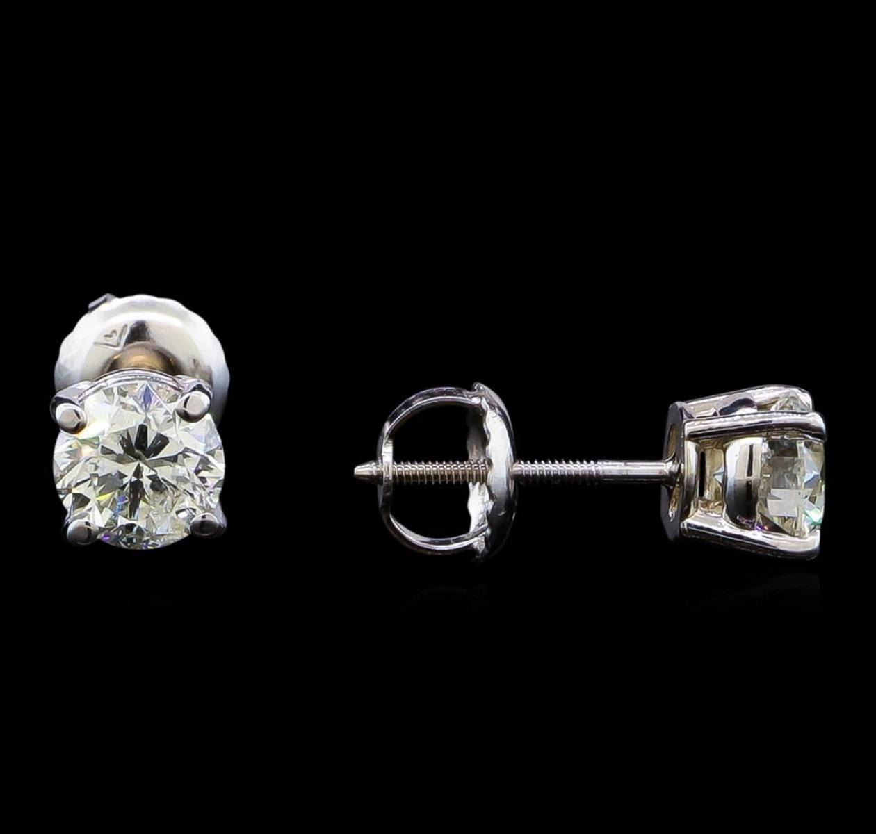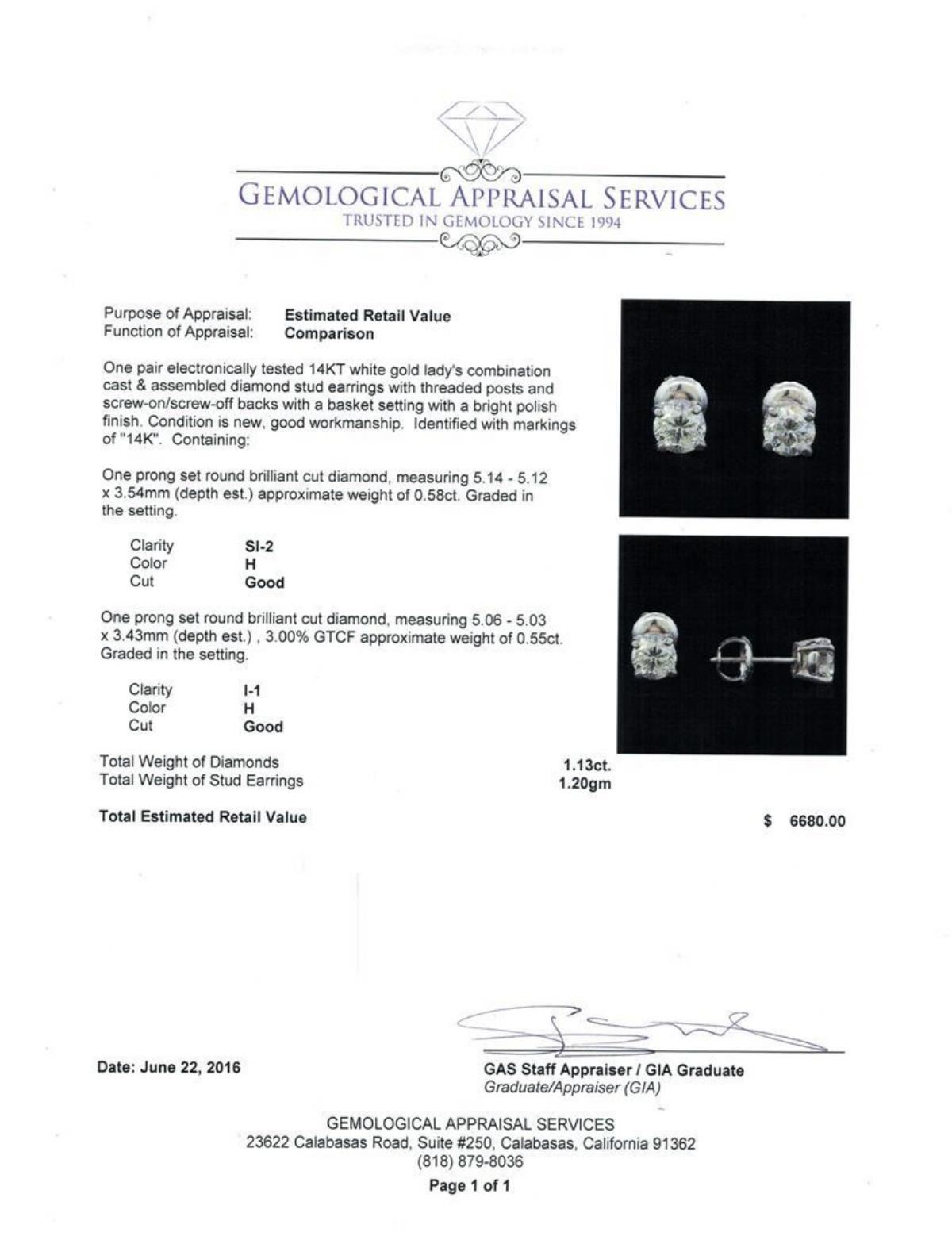 One pair electronically tested 14KT white gold lady's combination cast & assembled diamond stud earrings with threaded posts and screw-on/screw-off backs with a basket setting with a bright polish finish. Identified with markings of "14K". Condition is new, good workmanship. Containing: One prong set round brilliant cut diamond, measuring 5.14 - 5.12 x 3.54mm (depth est.) approximate weight of 0.58ct. Graded in the setting. Clarity: SI-2. Color: H. Cut Good One prong set round brilliant cut diamond, measuring 5.06 - 5.03 x 3.43mm (depth est.) , 3.00.%. GTCF approximate weight of 0.55ct. Graded in the setting. Clarity: I-1. Color: Good. Total Weight of Diamonds 1.13ct. Total Weight of Stud Earrings 1.20gm. GAS Appraised.