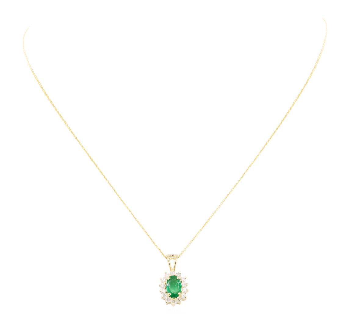 One electronically tested 14KT yellow gold lady's combination cast & assembled fashion pendant & chain 16.0' long, 0.8mm diamond cut cable link with a spring ring clasp with a basket halo with a bright polish finish. Identified with markings of '14K'. Condition is new, good workmanship. Containing: One prong set oval modified mixed cut natural emerald, measuring 8.05 x 5.13 x 3.33mm, (depth est.) approximate weight of 0.80ct., clarity is heavily included, medium, very slightly grayish, green color, (GIA G 5/3), cut is good. Transmitting light somewhat diffusely, semi-transparent to translucent. Naturally occurring internal & external characteristics are present. Indications of oil residue. Colored gemstones are presumed to have been subjected to commonly used enhancement processes. Graded in the setting. Fourteen prong set round brilliant cut diamonds, measuring 1.90 - 1.80 x 1.11mm (depth est.) approximate total weight of 14 Stones = 0.33ct. Graded in the setting. Color H - I Clarity SI-2 to I-1 Cut Good. Total Weight of Colored Stones 0.80ct.. Total Weight of Diamonds 0.33ct.. Total Weight of Pendant & Chain 3.50gm GAS Appraised at $1650.00. GAS Appraised at $1,650.00.
