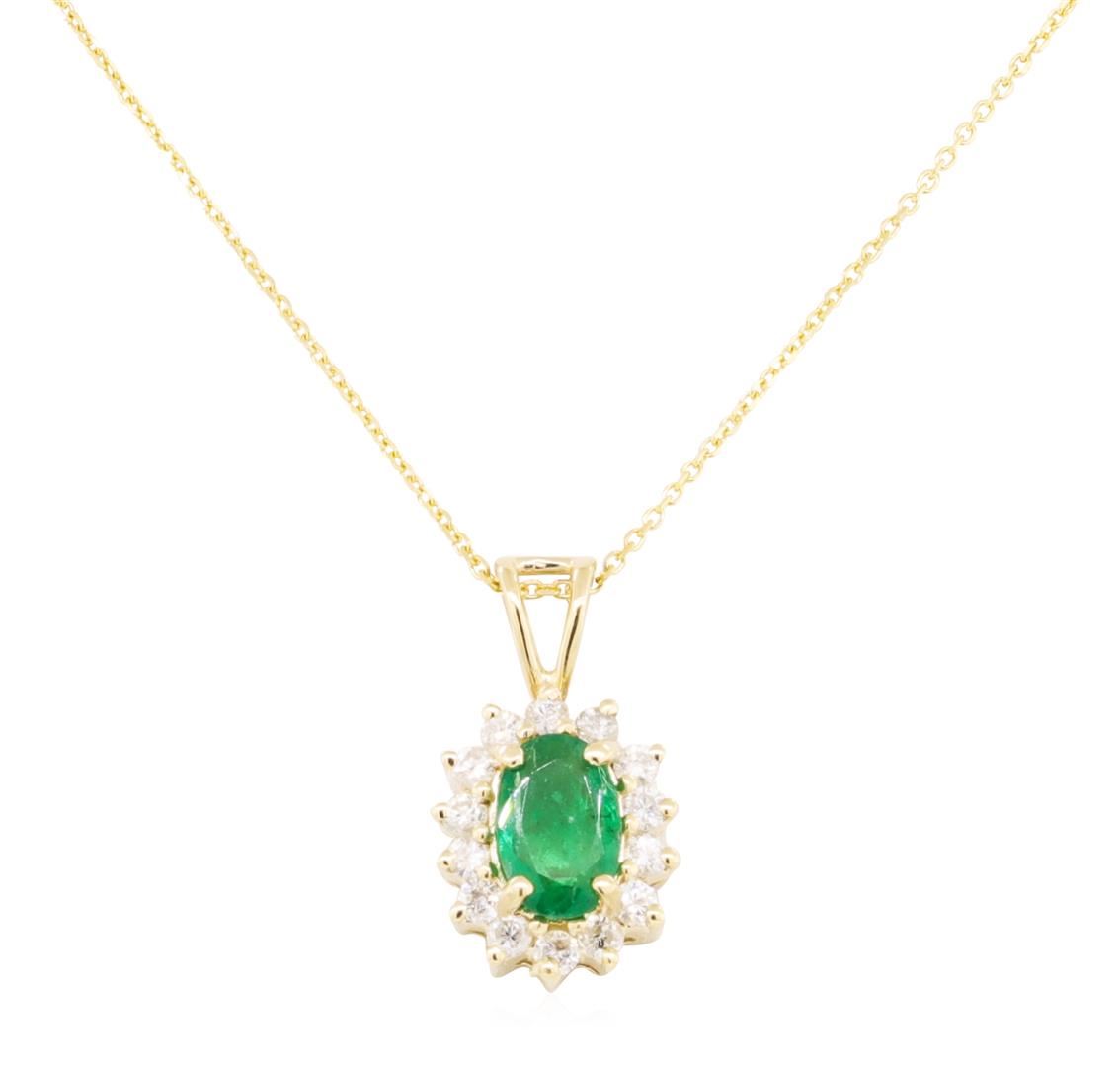 One electronically tested 14KT yellow gold lady's combination cast & assembled fashion pendant & chain 16.0' long, 0.8mm diamond cut cable link with a spring ring clasp with a basket halo with a bright polish finish. Identified with markings of '14K'. Condition is new, good workmanship. Containing: One prong set oval modified mixed cut natural emerald, measuring 8.05 x 5.13 x 3.33mm, (depth est.) approximate weight of 0.80ct., clarity is heavily included, medium, very slightly grayish, green color, (GIA G 5/3), cut is good. Transmitting light somewhat diffusely, semi-transparent to translucent. Naturally occurring internal & external characteristics are present. Indications of oil residue. Colored gemstones are presumed to have been subjected to commonly used enhancement processes. Graded in the setting. Fourteen prong set round brilliant cut diamonds, measuring 1.90 - 1.80 x 1.11mm (depth est.) approximate total weight of 14 Stones = 0.33ct. Graded in the setting. Color H - I Clarity SI-2 to I-1 Cut Good. Total Weight of Colored Stones 0.80ct.. Total Weight of Diamonds 0.33ct.. Total Weight of Pendant & Chain 3.50gm GAS Appraised at $1650.00. GAS Appraised at $1,650.00.