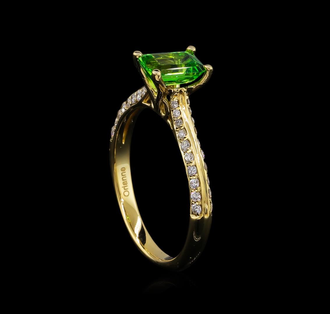 One electronically tested 14KT yellow gold lady's cast fashion ring with a bright polish finish. The featured lady's ring has a shank measuring 2.28 millimeters wide. Trademark is Orianne. Identified with markings of "14K". Condition is new, good workmanship. Containing: One prong set emerald step cut natural tsavorite garnet, measuring 6.88 x 4.95 x 3.40mm, approximate weight of 1.13ct., clarity is eye clean, type II, medium, moderately strong, slightly yellowish green color, (GIA slyG 5/4), cut is very good. Transmitting light with no distortion, transparent. Colored gemstones are presumed to have been subjected to commonly used enhancement processes. Graded in the setting. Forty prong set round brilliant cut diamonds, measuring 1.35 - 1.15 x 0.77mm (depth est.) approximate total weight of 40 Stones = 0.32ct. Graded in the setting. Clarity: SI-1 to I-1. Color: G - I. Cut Good. Total Weight of Colored Stones 1.13ct. Total Weight of Diamonds 0.32ct. Total Weight of Ring 2.80gm. GAS Appraised at $6,200.00.