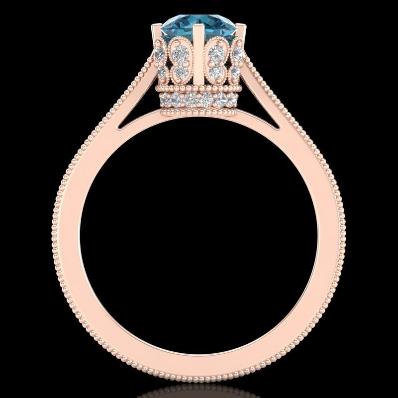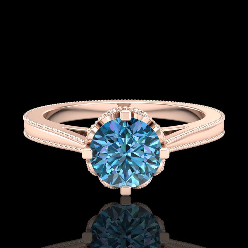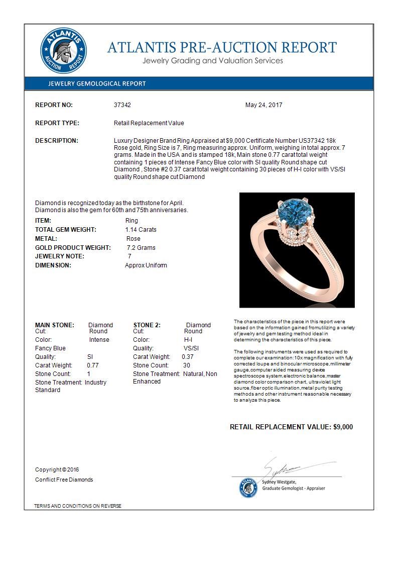 1.14 CTW Fancy Intense Blue Diamond Solitaire Art Deco Ring 18K Rose Gold ---- Luxury Designer Brand Ring Appraised Retail Price at $9,000 ---- SKU Number US37342 18k Rose gold Ring Size is 7, Ring measuring approx. Uniform, weighing in total approx. 7 grams. Made in the USA and is stamped 18k, Main stone 0.77 carat total weight containing 1 pieces of Intense Fancy Blue color with SI quality Round shape cut Diamond , Stone #2 0.37 carat total weight containing 30 pieces of H-I color with VS/SI quality Round shape cut