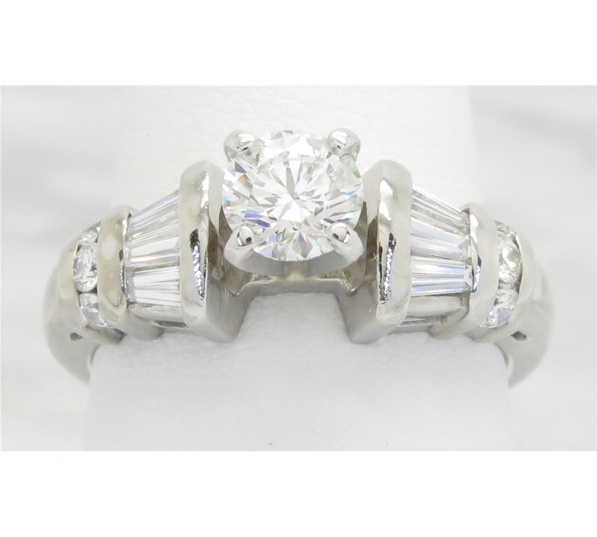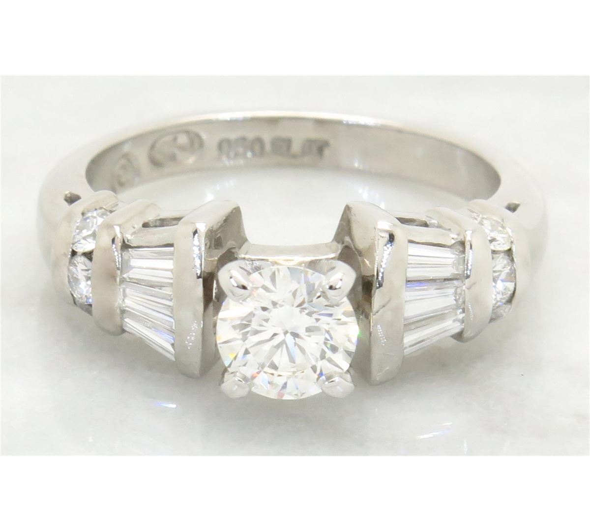 One tested platinum certified diamond ring. Containing: One GIA Certified Round Brilliant Cut Diamond. Size: .58CT, Clarity: VS2, Color: I. 6 Round Brilliant Cut Diamonds. Approximate total diamond weight: 1.14CTW. All diamonds are graded in the mounting unless otherwise stated. Weight of ring: 8.0 grams, Size: 6.25. The diamond is laser inscribed with the GIA certification number 1055****. We do not have a copy of the certificate. Weight, color and clarity were confirmed by calling GIA.