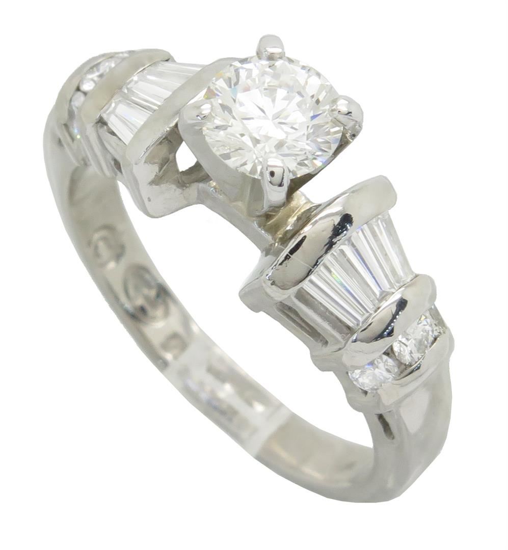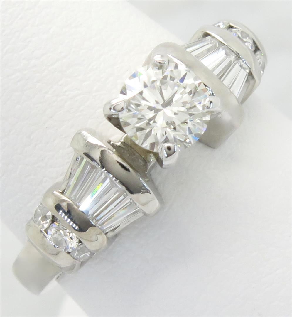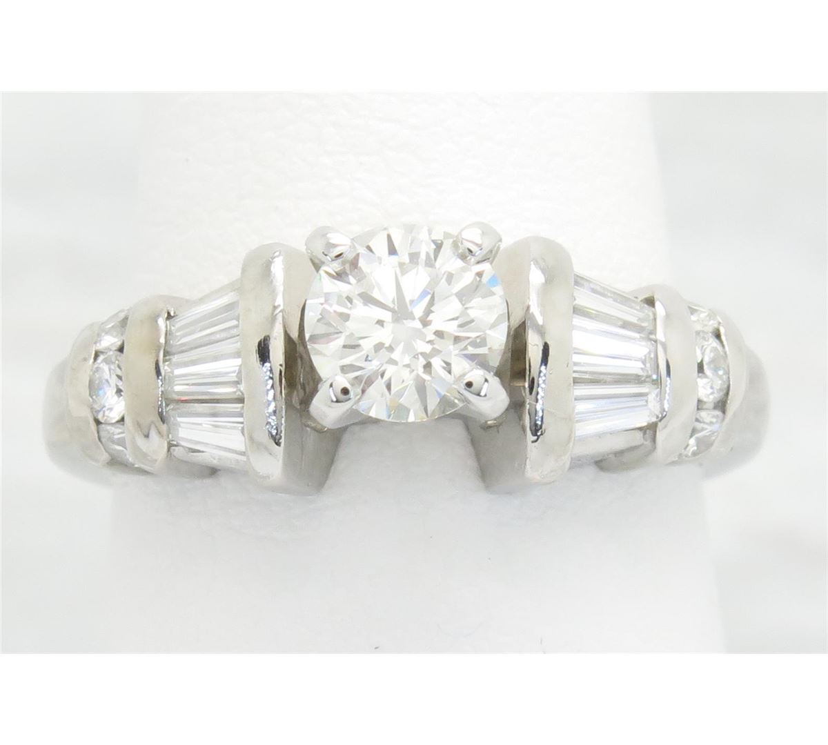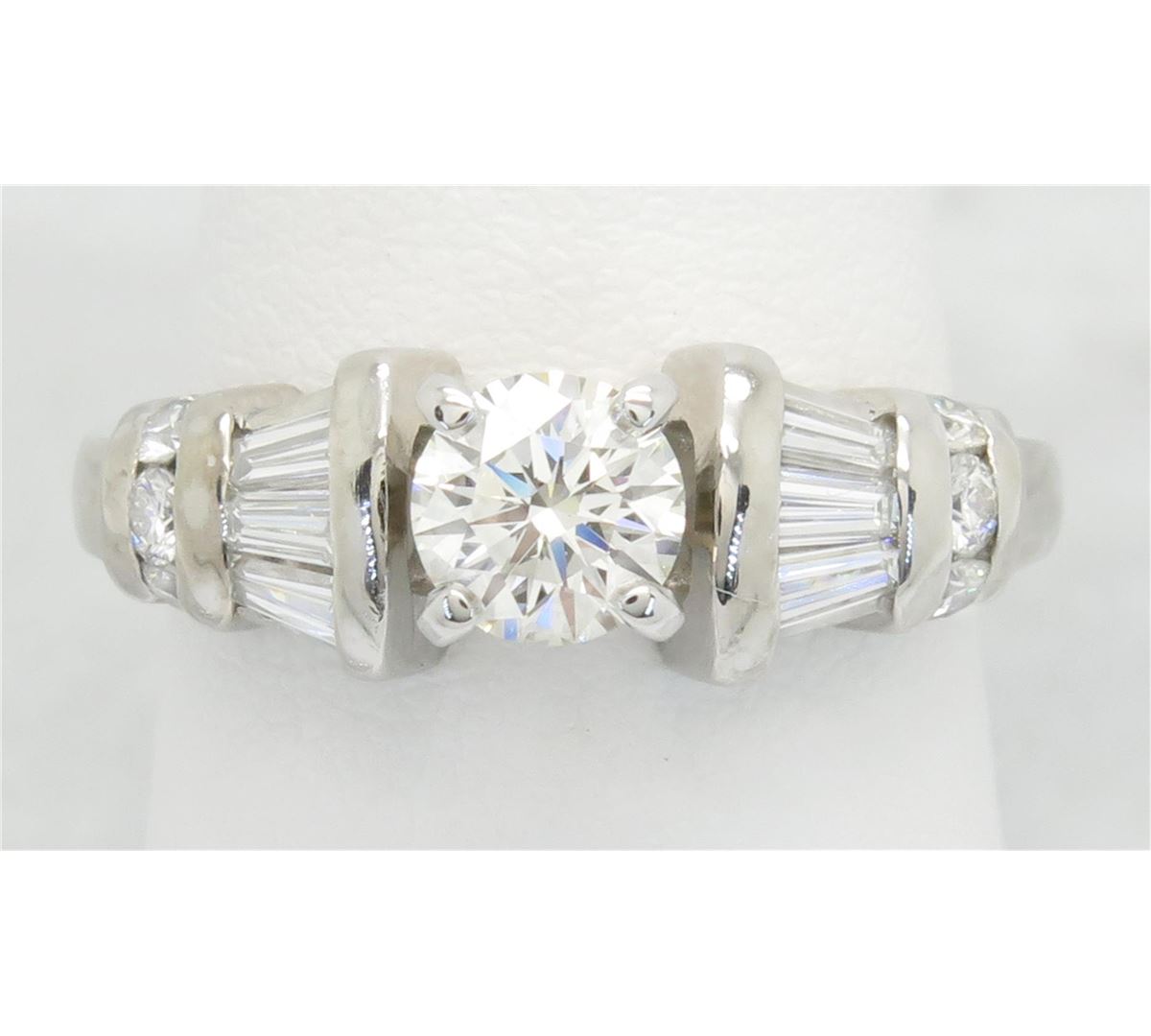 One tested platinum certified diamond ring. Containing: One GIA Certified Round Brilliant Cut Diamond. Size: .58CT, Clarity: VS2, Color: I. 6 Round Brilliant Cut Diamonds. Approximate total diamond weight: 1.14CTW. All diamonds are graded in the mounting unless otherwise stated. Weight of ring: 8.0 grams, Size: 6.25. The diamond is laser inscribed with the GIA certification number 1055****. We do not have a copy of the certificate. Weight, color and clarity were confirmed by calling GIA.