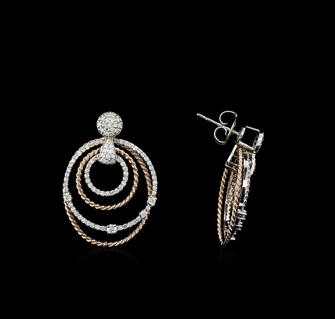 One pair electronically tested 14KT rose and white gold lady's combination cast & assembled dangle circle earrings with friction posts with a bright polish finish. The featured pair of lady's earring has four intertwining circles and a drop measuring 30 millimeters long. Condition is new, good workmanship. Containing: Eight prong set round brilliant cut diamonds, measuring 1.90 - 1.80 x 1.15mm (depth est.) approximate total weight of 8 Stones = 0.19ct. Graded in the setting. Clarity SI-1 to I-1. Color: G - H Cut Good One Hundred Eighty-Eight prong set round brilliant cut diamonds, measuring 1.15 - 1.05 x 0.68mm (depth est.) approximate total weight of 188 Stones = 0.95ct. Graded in the setting. Clarity SI-1 to I-1. Color: G - H Cut Good. Total Weight of Diamonds 1.14ct.. Total Weight of Earrings 7.80gm GAS Appraised at $5,585.00.