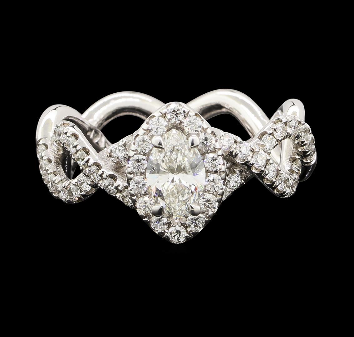One electronically tested 14KT white gold lady's cast wedding ring with a overlapping split shank with a bright polish finish. The featured lady's ring has a shank measuring 3.40 millimeters wide. Identified with markings of '14K'. Condition is new, good workmanship. Containing: One prong set marquise shaped cut diamond, measuring 7.14 x 4.55 x 2.95mm (depth est.) approximate weight of 0.56ct. Graded in the setting. Clarity SI-2. Color: H Cut Good Forty-Six prong set round brilliant cut diamonds, measuring 1.50 - 1.45 x 0.92mm (depth est.) approximate total weight of 46 Stones = 0.58ct. Graded in the setting. Clarity SI-1 to SI-2. Color: G - H Cut Very Good. Total Weight of Diamonds 1.14ct.. Total Weight of Ring 5.10gm. GAS Appraised at $4,895.00.