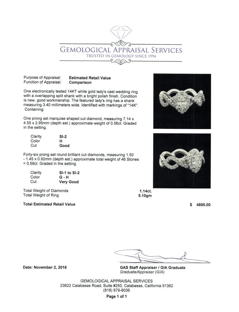 One electronically tested 14KT white gold lady's cast wedding ring with a overlapping split shank with a bright polish finish. The featured lady's ring has a shank measuring 3.40 millimeters wide. Identified with markings of '14K'. Condition is new, good workmanship. Containing: One prong set marquise shaped cut diamond, measuring 7.14 x 4.55 x 2.95mm (depth est.) approximate weight of 0.56ct. Graded in the setting. Clarity SI-2. Color: H Cut Good Forty-Six prong set round brilliant cut diamonds, measuring 1.50 - 1.45 x 0.92mm (depth est.) approximate total weight of 46 Stones = 0.58ct. Graded in the setting. Clarity SI-1 to SI-2. Color: G - H Cut Very Good. Total Weight of Diamonds 1.14ct.. Total Weight of Ring 5.10gm. GAS Appraised at $4,895.00.