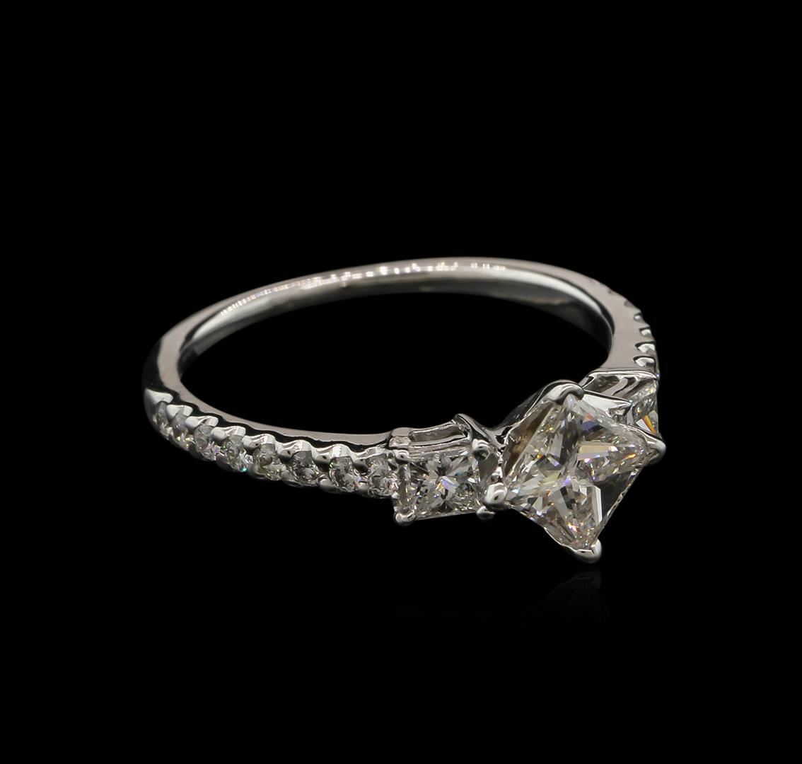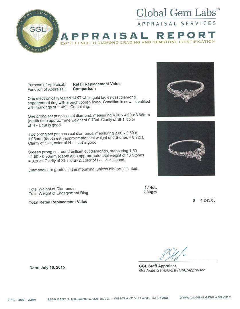 One electronically tested 14KT white gold ladies cast diamond engagement ring with a bright polish finish. Identified with markings of "14K". Condition is new. Containing: One prong set princess cut diamond, measuring 4.90 x 4.90 x 3.68mm (depth est.) approximate weight of 0.73ct. Clarity: SI-1. Color: H - I, Cut is Good. Two prong set princess cut diamonds, measuring 2.60 x 2.60 x 1.95mm (depth est.) approximate total weight of 2 Stones = 0.22ct. Clarity: SI-1. Color: H - I, Cut is Good. Sixteen prong set round brilliant cut diamonds, measuring 1.50 - 1.50 x 0.90mm (depth est.) approximate total weight of 16 Stones = 0.20ct. Clarity: SI-1 to SI-2. Color: I - J, Cut is Good. Diamonds are graded in the mounting, unless otherwise stated. Total Weight of Diamonds 1.14ct. Total Weight of Engagement Ring 2.80 grams. GGL Appraised at $4,245.00.