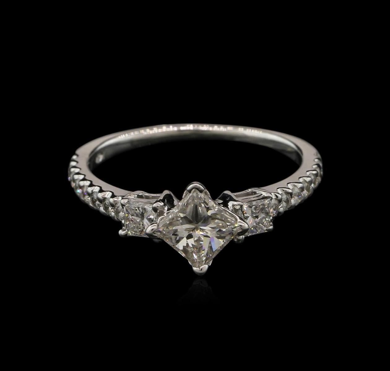 One electronically tested 14KT white gold ladies cast diamond engagement ring with a bright polish finish. Identified with markings of "14K". Condition is new. Containing: One prong set princess cut diamond, measuring 4.90 x 4.90 x 3.68mm (depth est.) approximate weight of 0.73ct. Clarity: SI-1. Color: H - I, Cut is Good. Two prong set princess cut diamonds, measuring 2.60 x 2.60 x 1.95mm (depth est.) approximate total weight of 2 Stones = 0.22ct. Clarity: SI-1. Color: H - I, Cut is Good. Sixteen prong set round brilliant cut diamonds, measuring 1.50 - 1.50 x 0.90mm (depth est.) approximate total weight of 16 Stones = 0.20ct. Clarity: SI-1 to SI-2. Color: I - J, Cut is Good. Diamonds are graded in the mounting, unless otherwise stated. Total Weight of Diamonds 1.14ct. Total Weight of Engagement Ring 2.80 grams. GGL Appraised at $4,245.00.