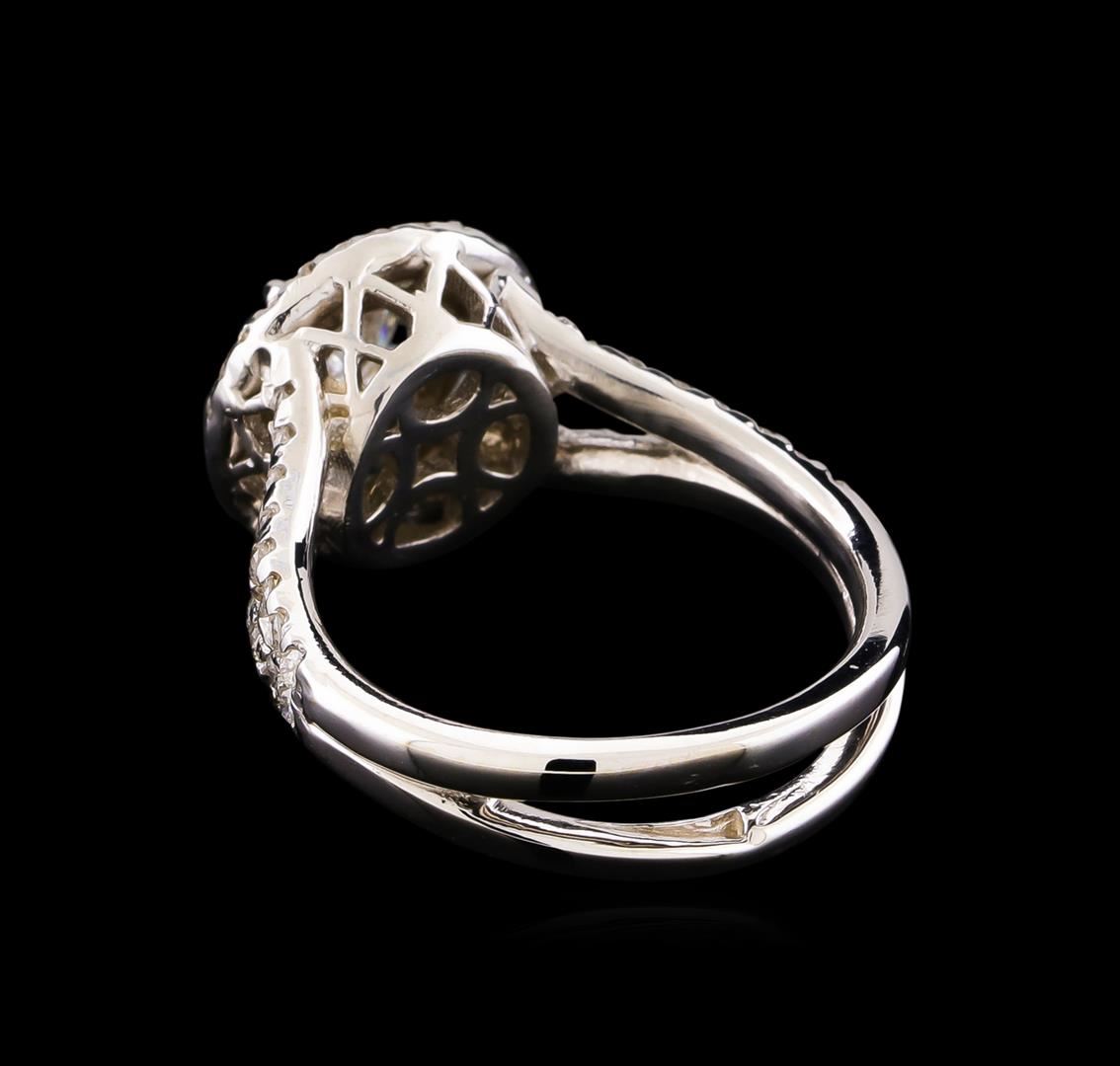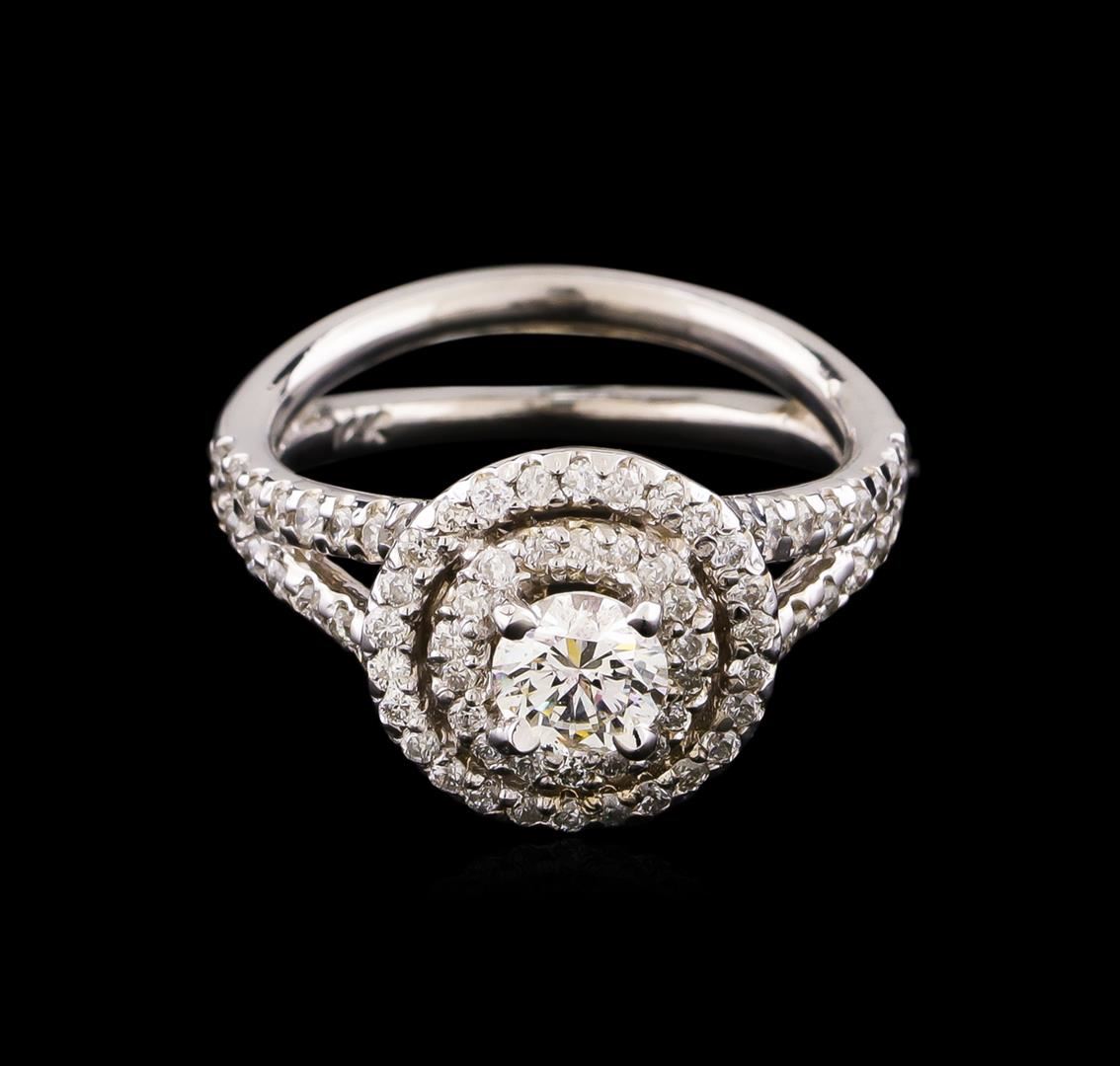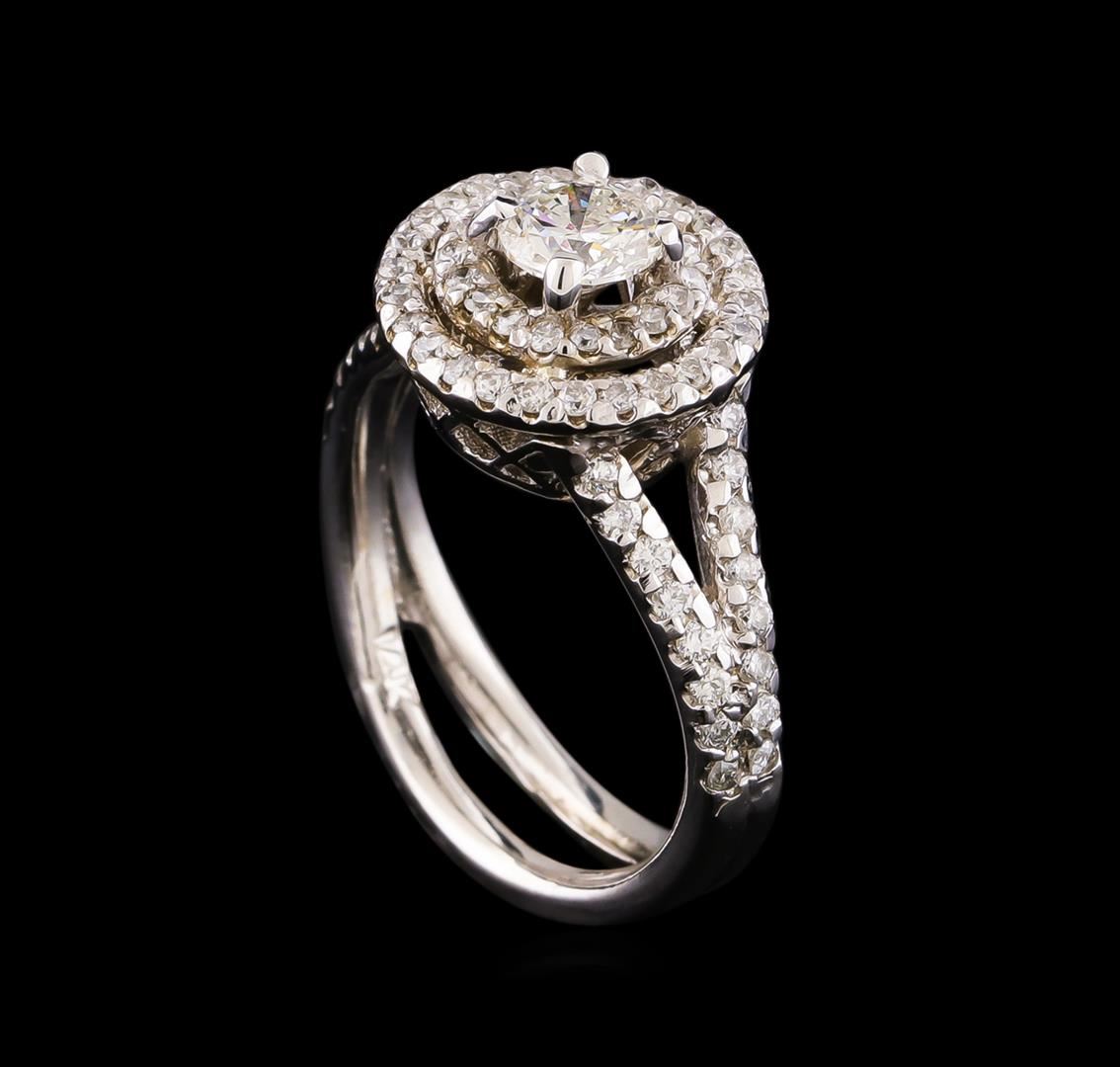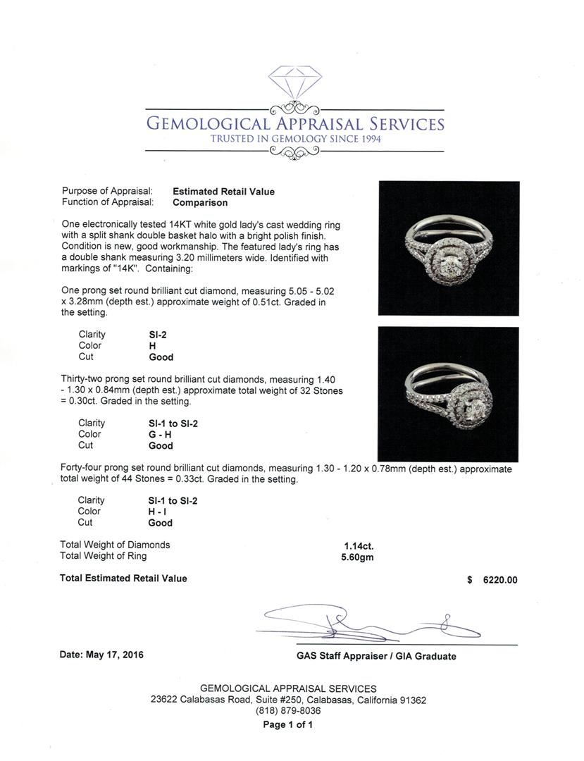 One electronically tested 14KT white gold lady's cast wedding ring with a split shank double basket halo with a bright polish finish. The featured lady's ring has a double shank measuring 3.20 millimeters wide. Identified with markings of "14K". Condition is new, good workmanship. Containing: One prong set round brilliant cut diamond, measuring 5.05 - 5.02 x 3.28mm (depth est.) approximate weight of 0.51ct. Graded in the setting. Clarity: SI-2. Color: Good Thirty-Two prong set round brilliant cut diamonds, measuring 1.40 - 1.30 x 0.84mm (depth est.) approximate total weight of 32 Stones = 0.30 ct. Graded in the setting. Clarity: SI-1 to SI-2. Color: G - Good Forty-Four prong set round brilliant cut diamonds, measuring 1.30 - 1.20 x 0.78mm (depth est.) approximate total weight of 44 Stones = 0.33ct. Graded in the setting. Clarity: SI-1 to SI-2. Color: H - I. Cut Good. Total Weight of Diamonds 1.14ct. Total Weight of Ring 5.60gm. GAS Appraised at $6,220.00.